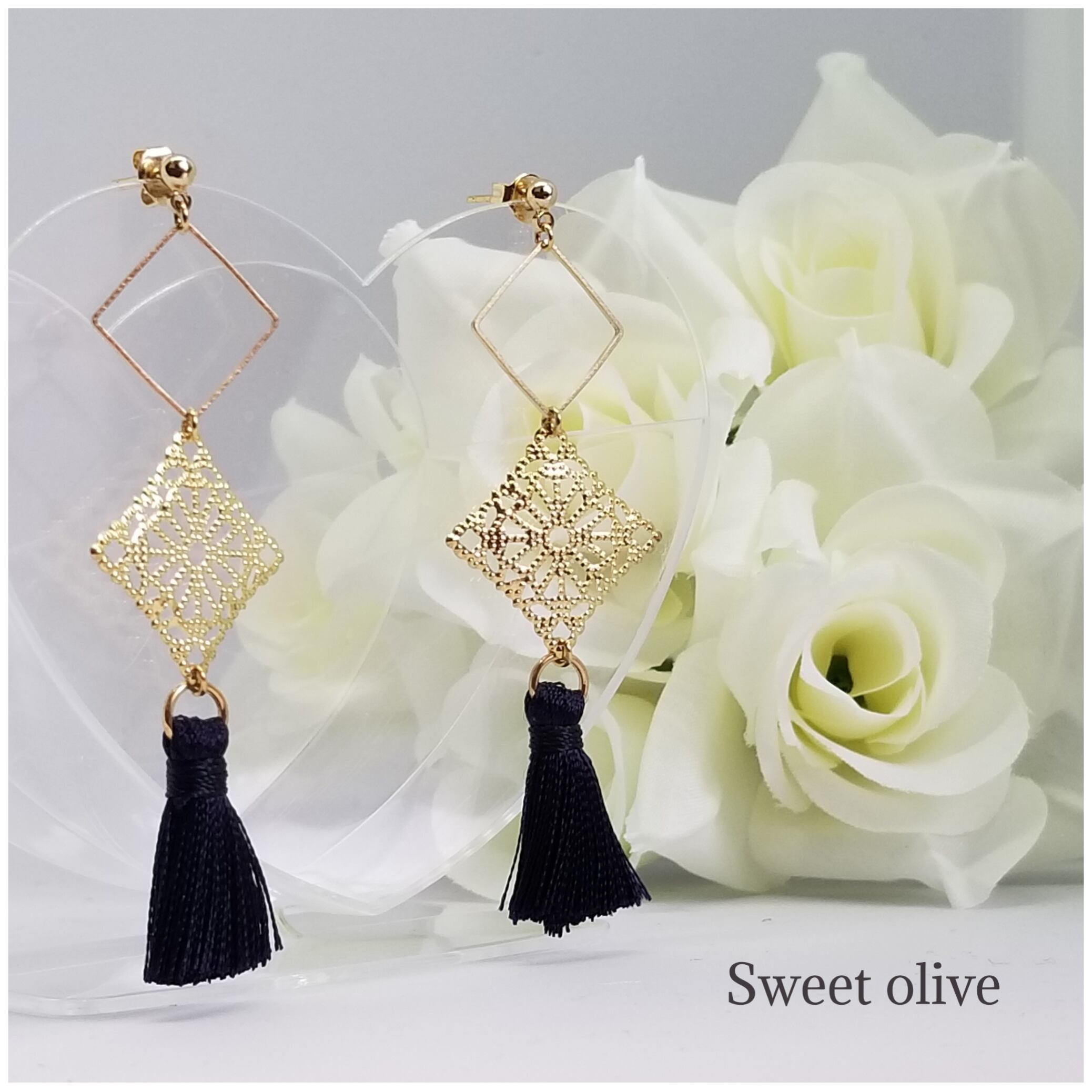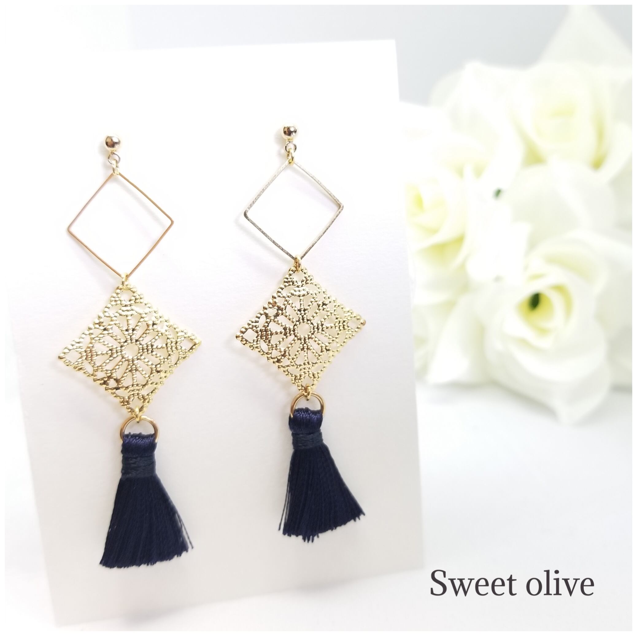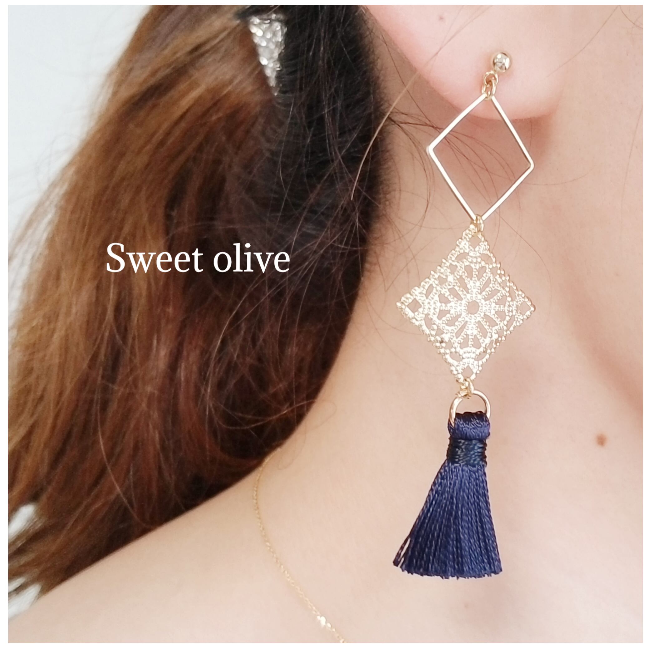 ダブル透かしスクエアにタッセルを組み合わせたピアス♪フェイスラインにかかり横顔美人☆濃紺のタッセルが上品な印象を演出します!