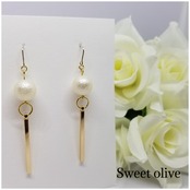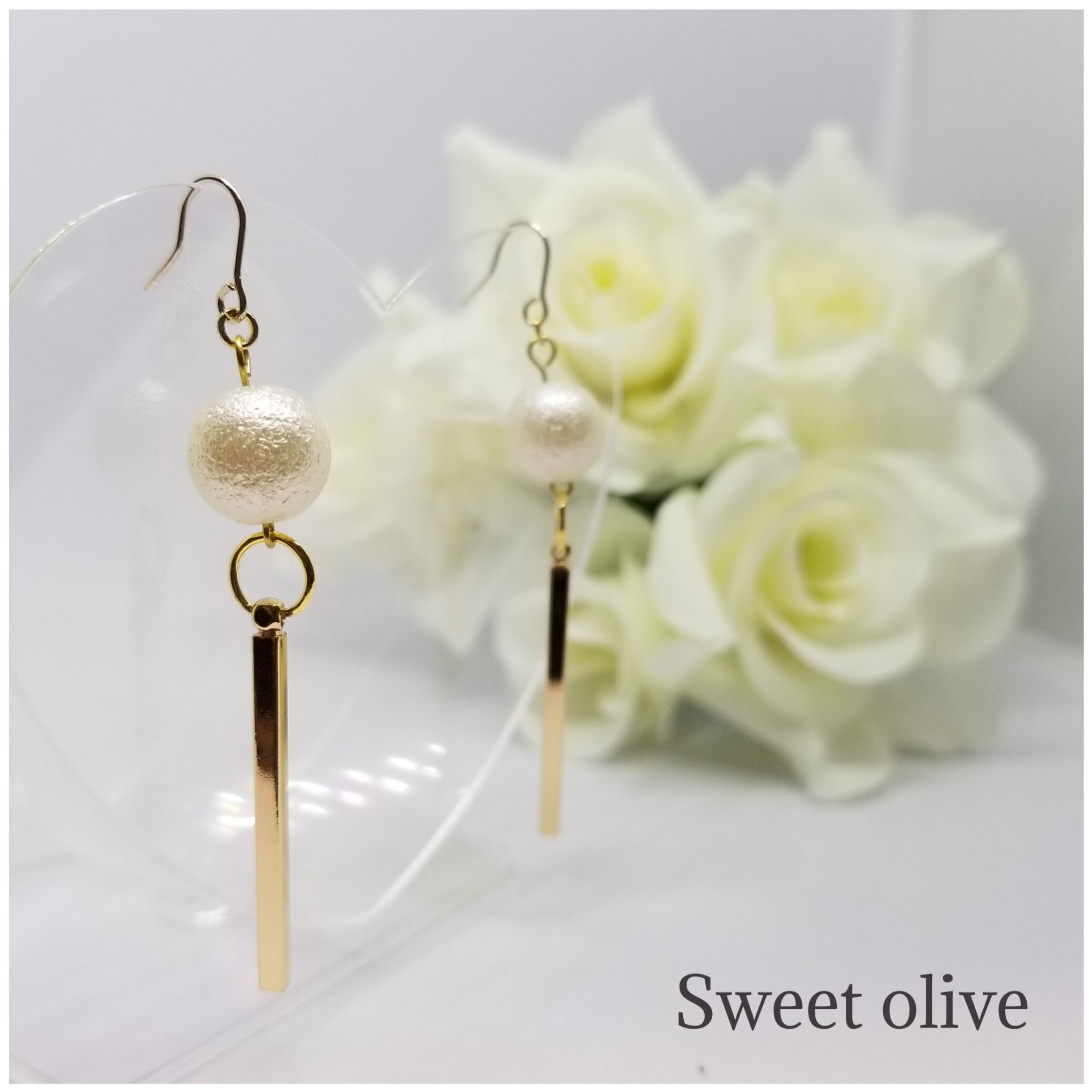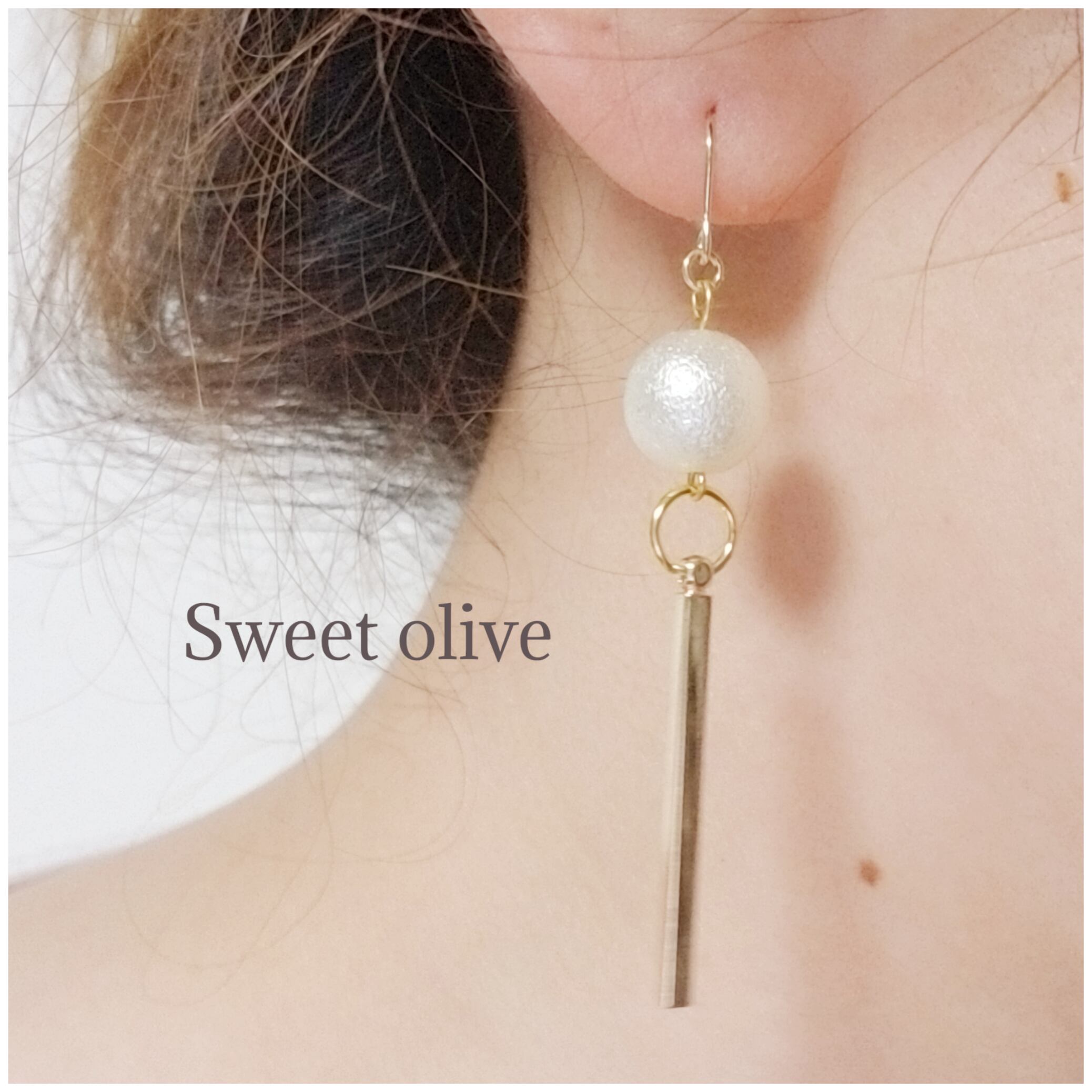 シンプルに揺れるゴールドバーとコロンとした大ぶりなコットンパールが素敵☆