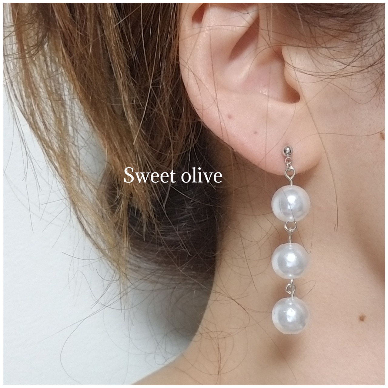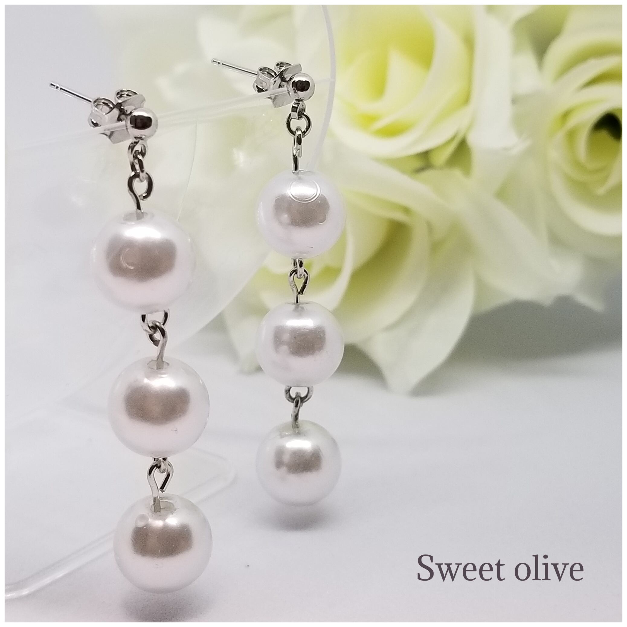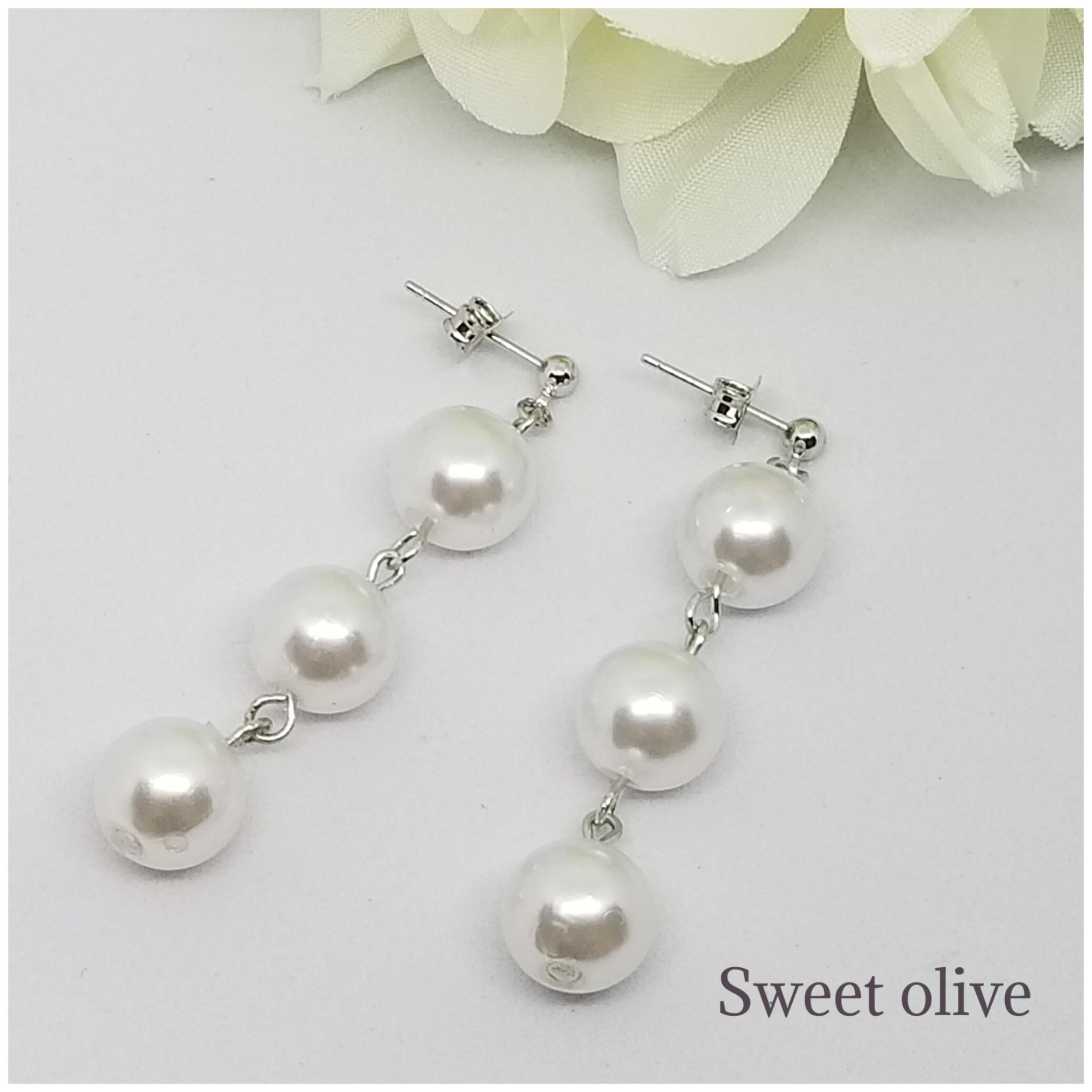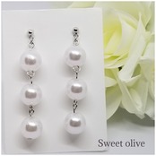 ホワイトパールのつやがあり、三個繋げることでボリュームむもあります♪一粒パールが物足りない方にはオススメです☆