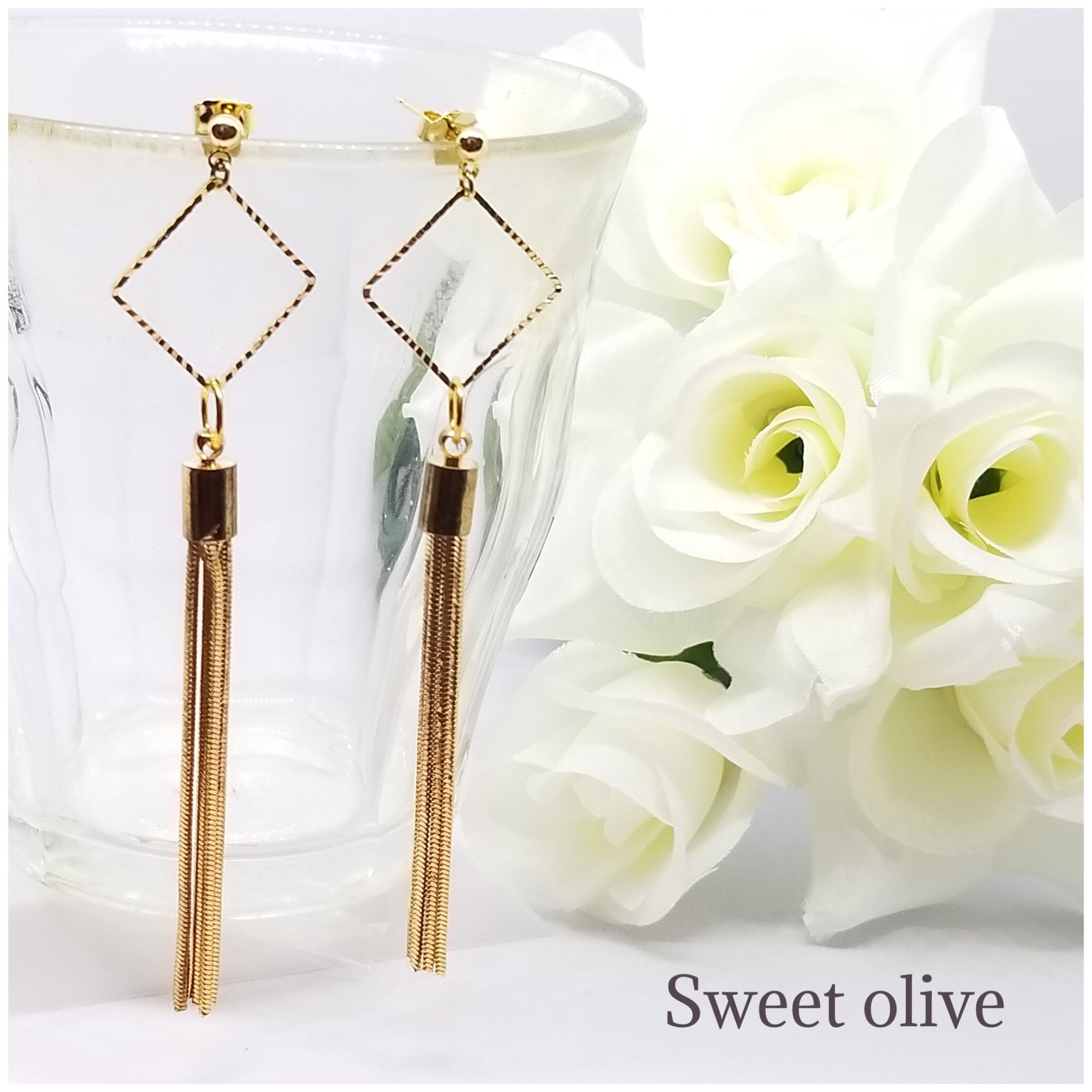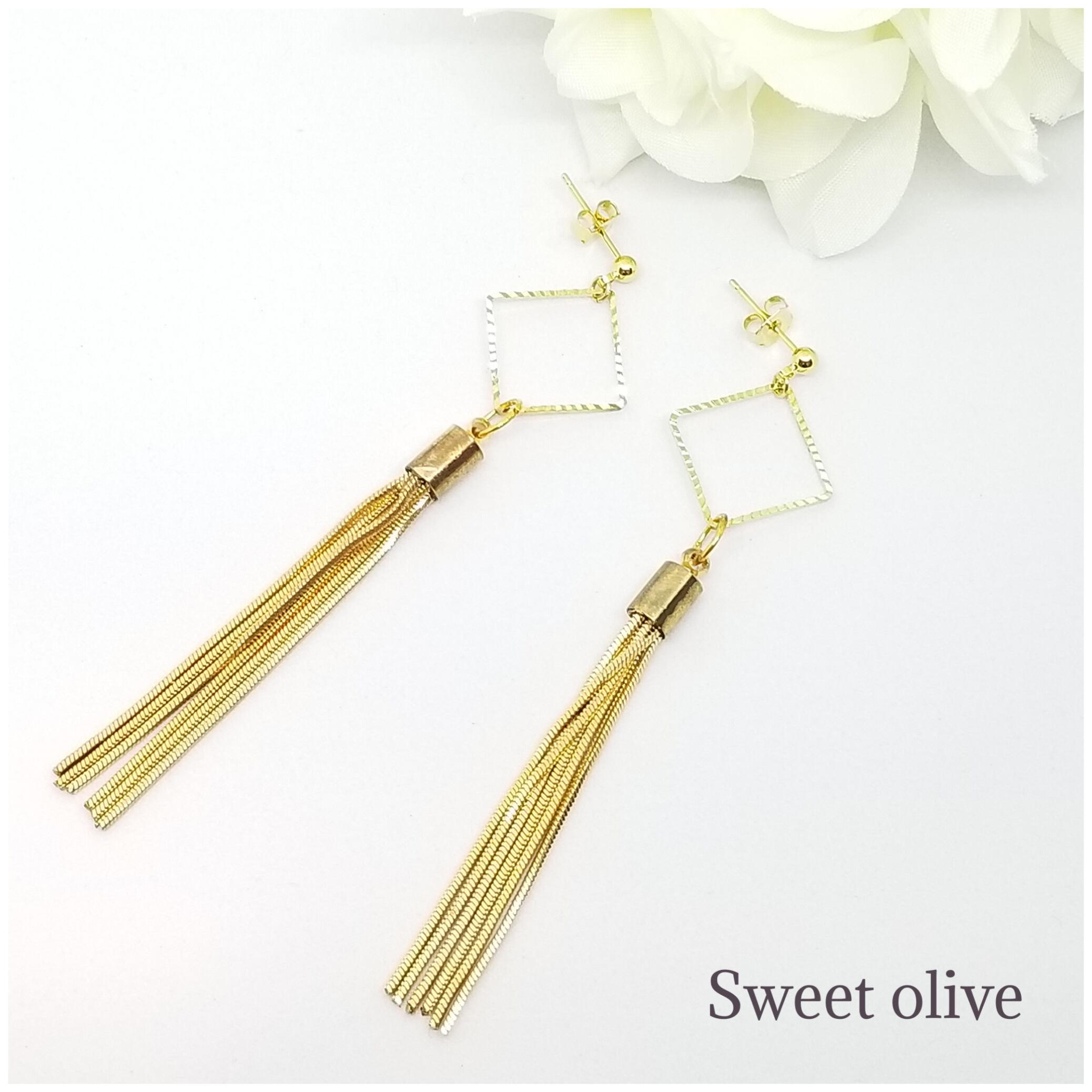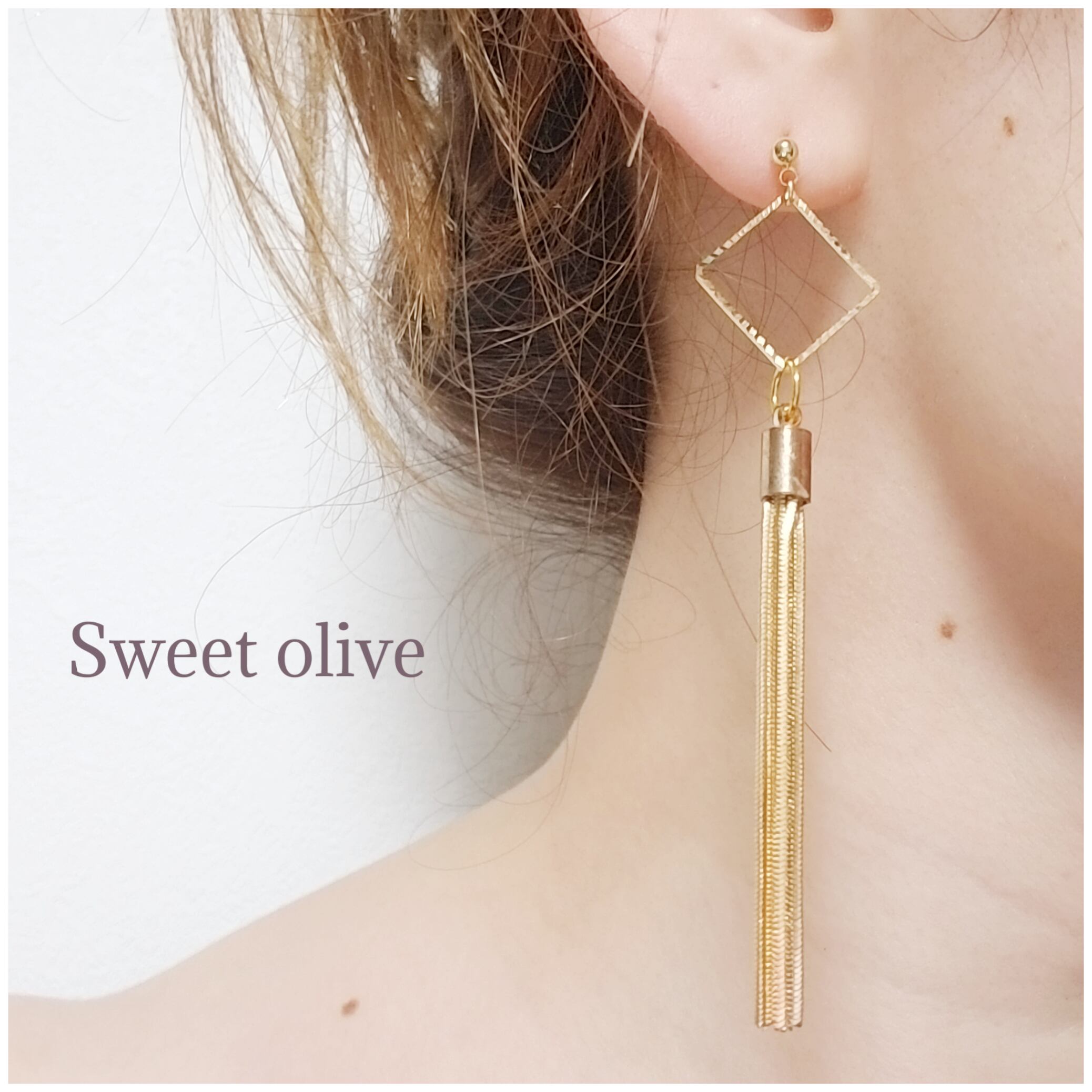 ゴールドのロングチェーンタッセルとスクエアを組み合わせたシンプルでありながらゴージャスなピアスです☆