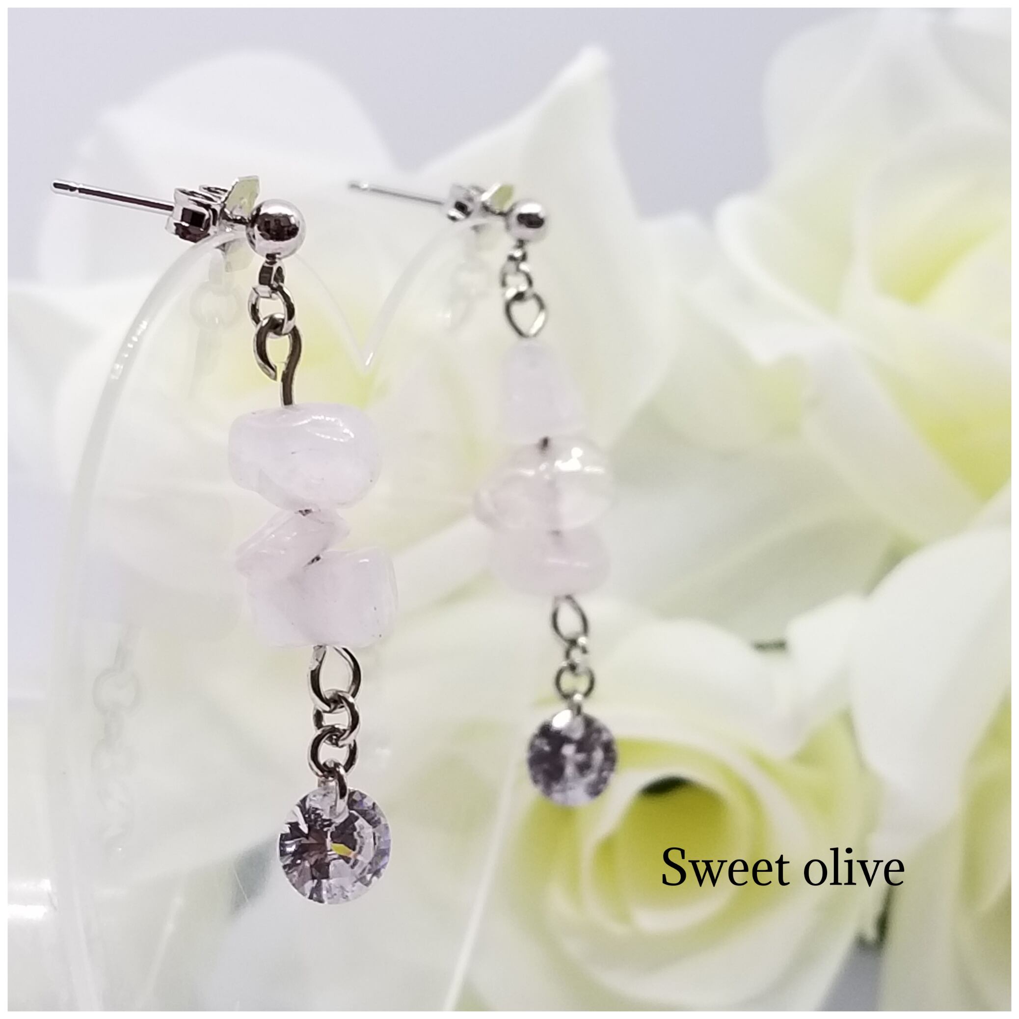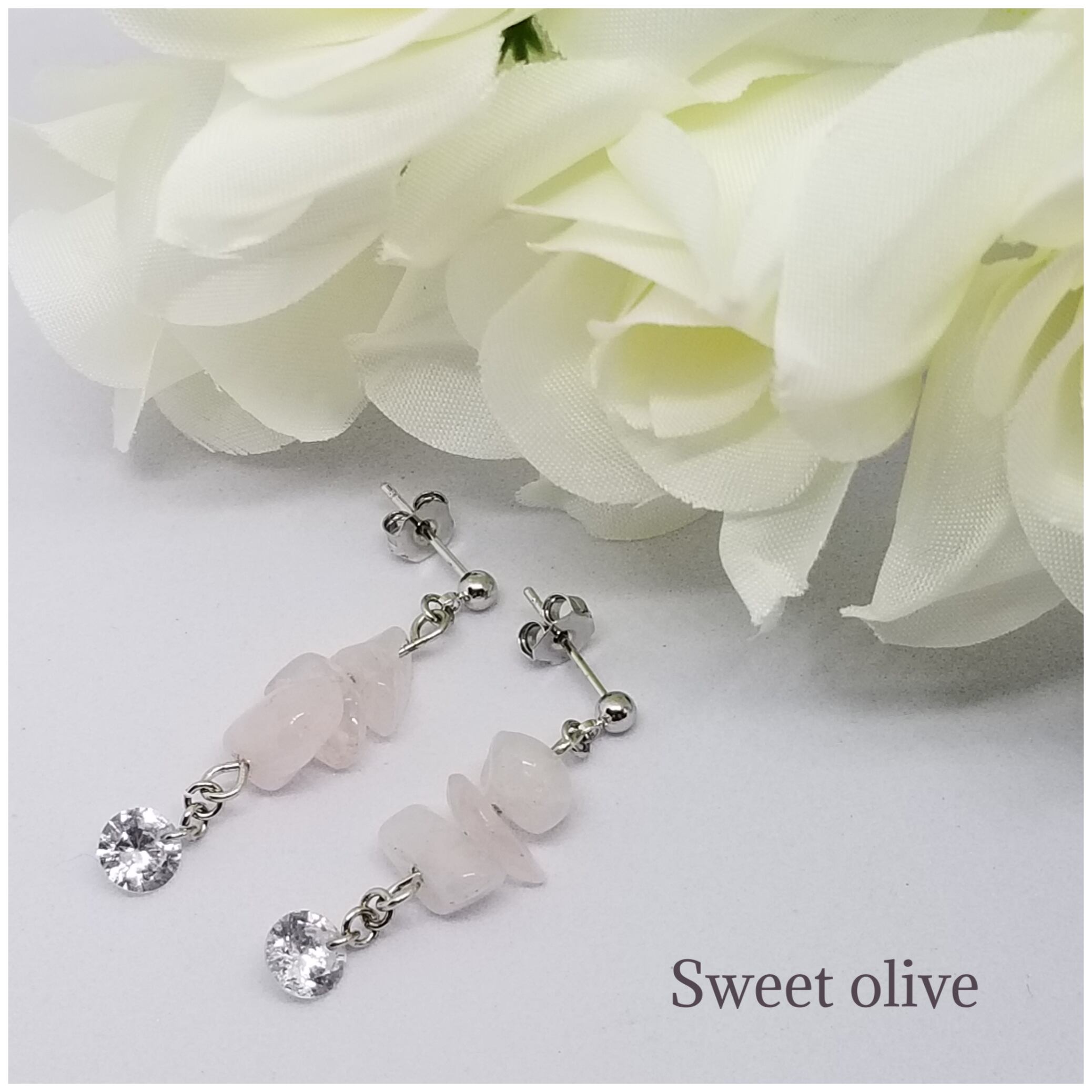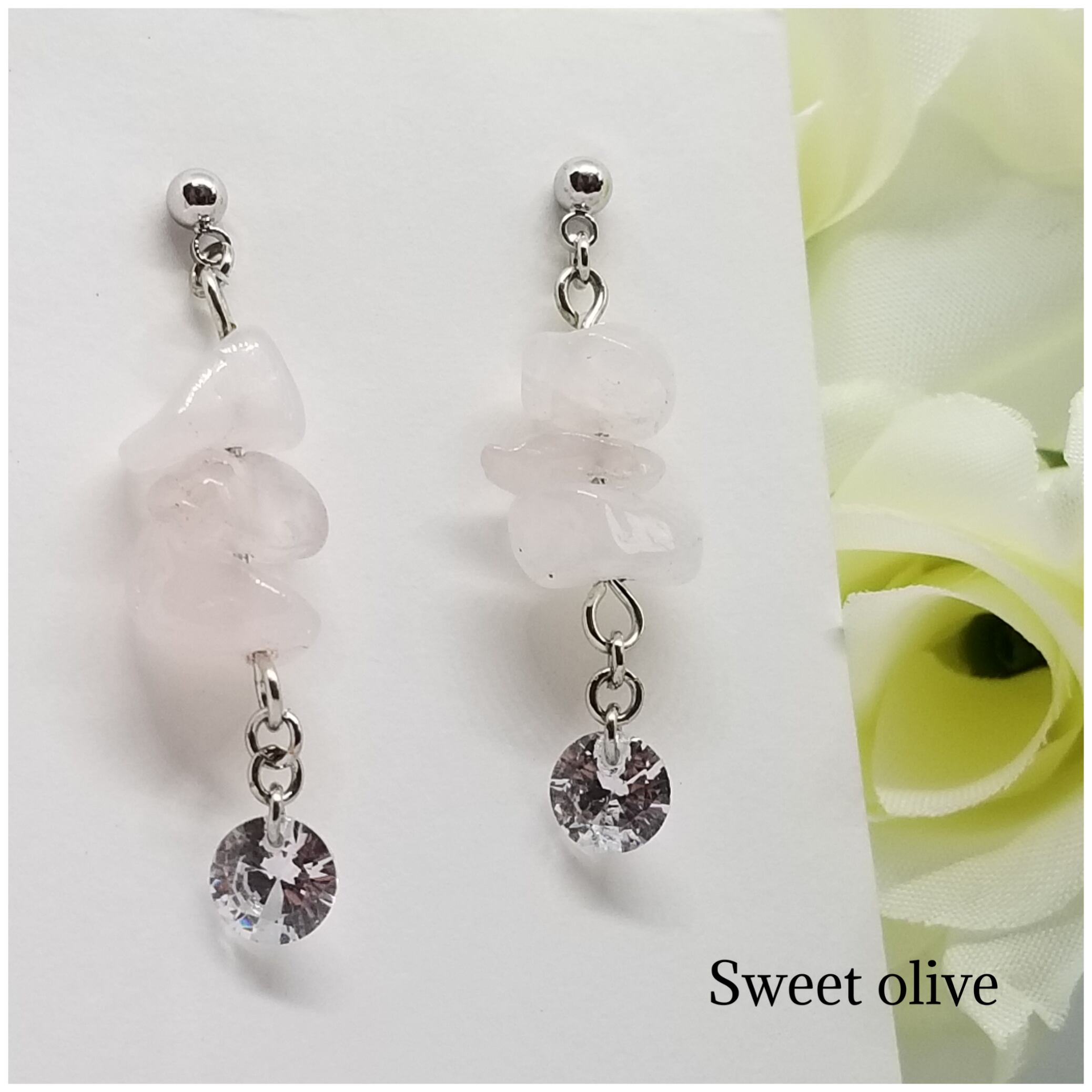 天然石のローズクォーツのさざれ石と高級ガラスのストーン一粒を合わせました。
