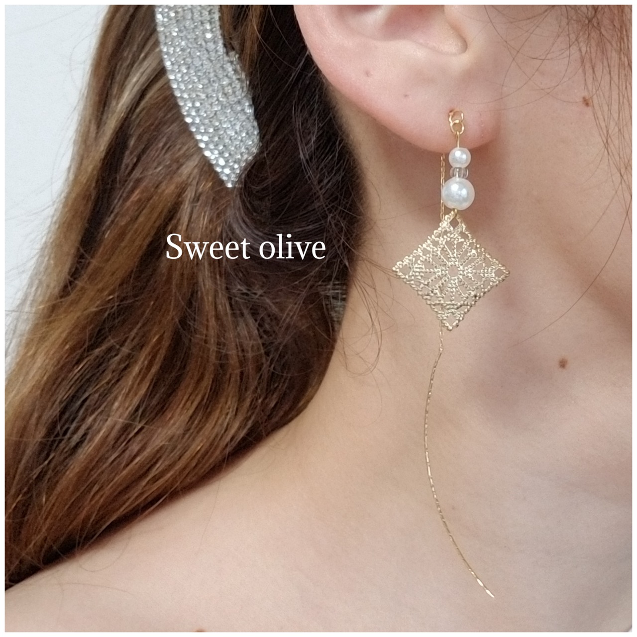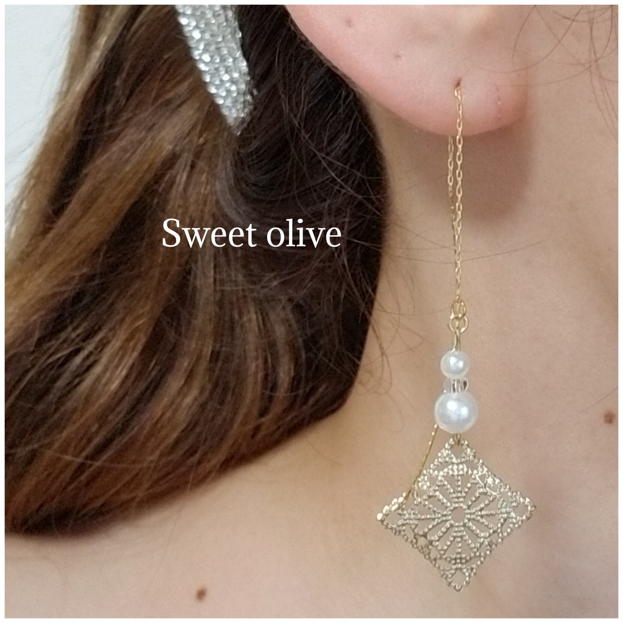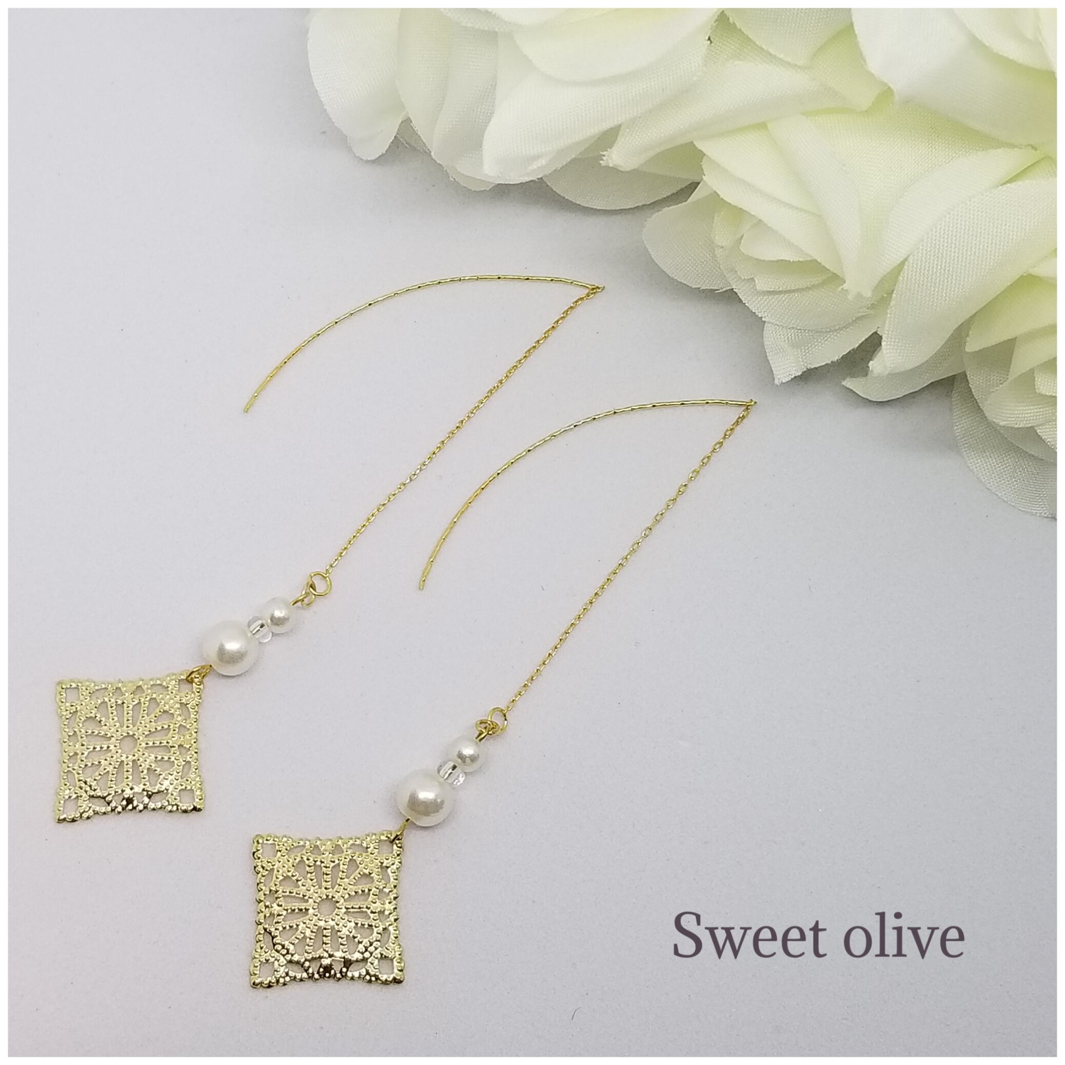 透かしスクエアに大きさの違うパールをアメリカンピアスに付けました☆長さ調節ができるので、長く着けたい方にも◎ヴィンテージ風に仕上げました♪