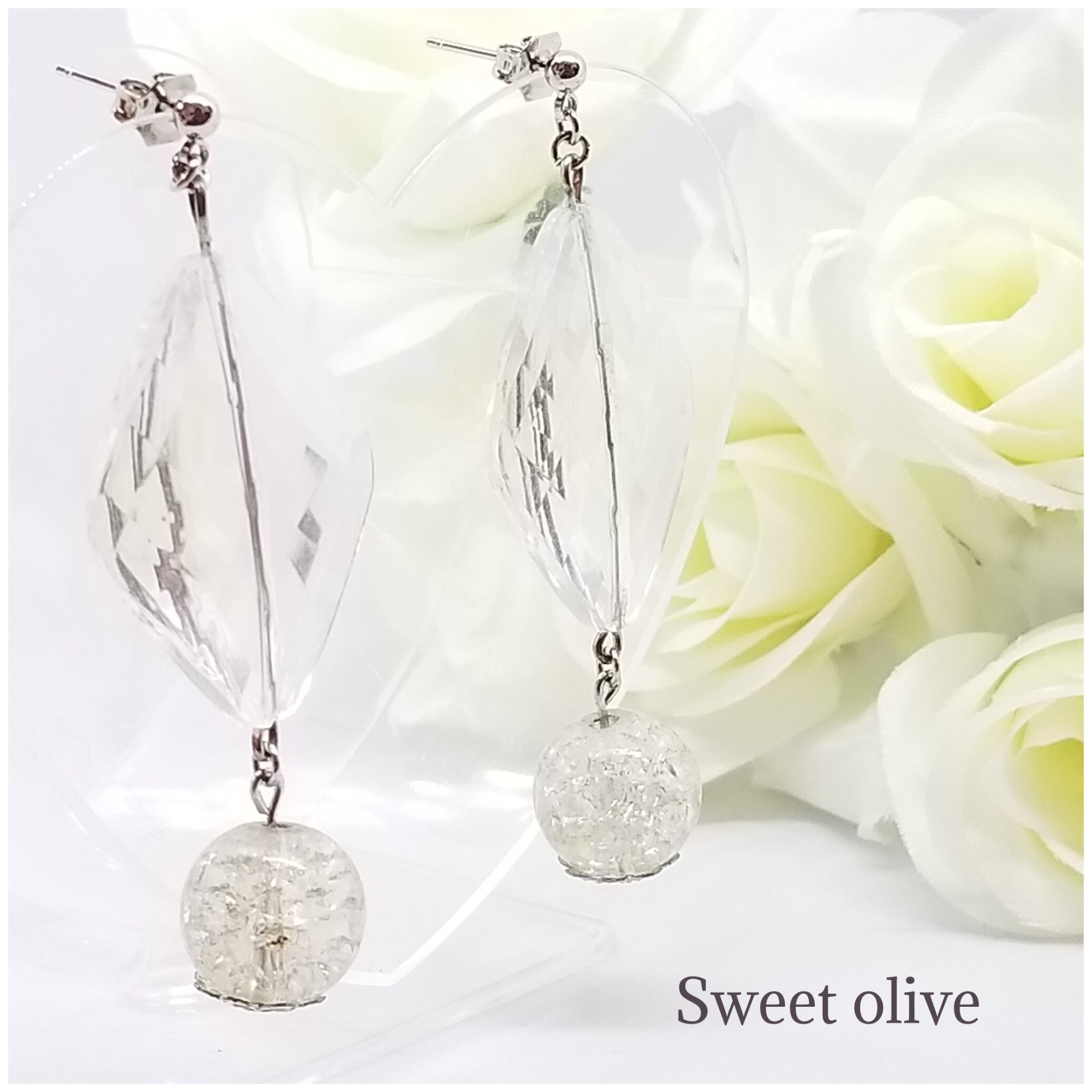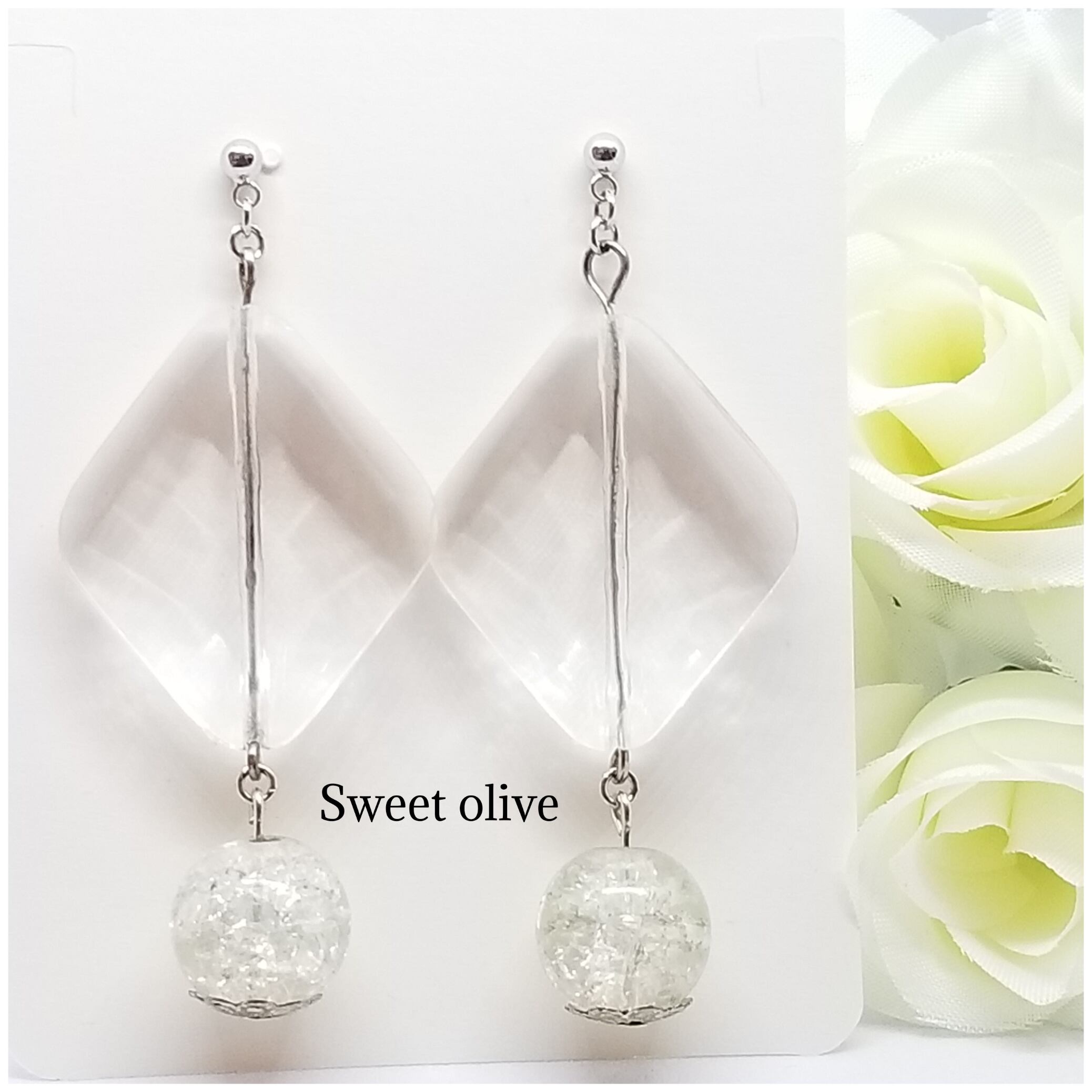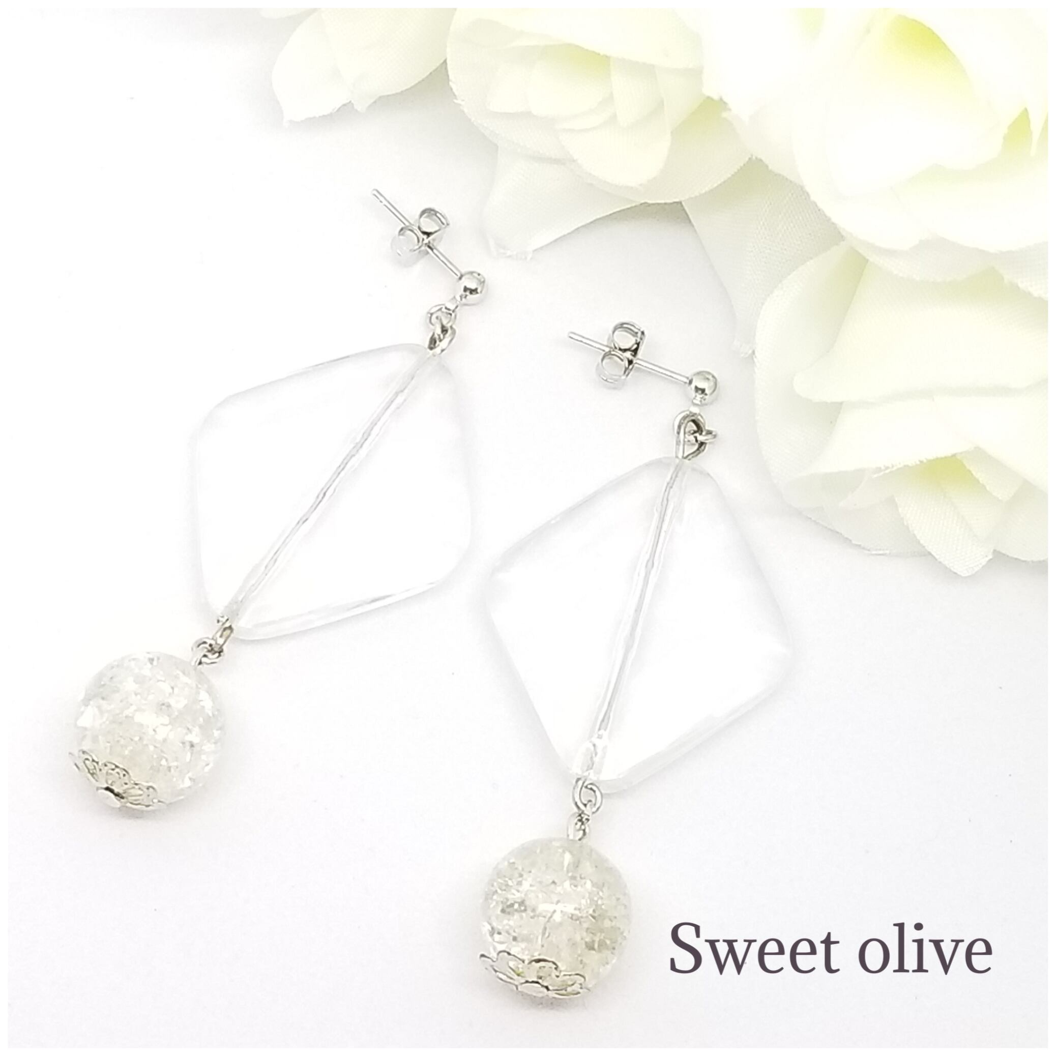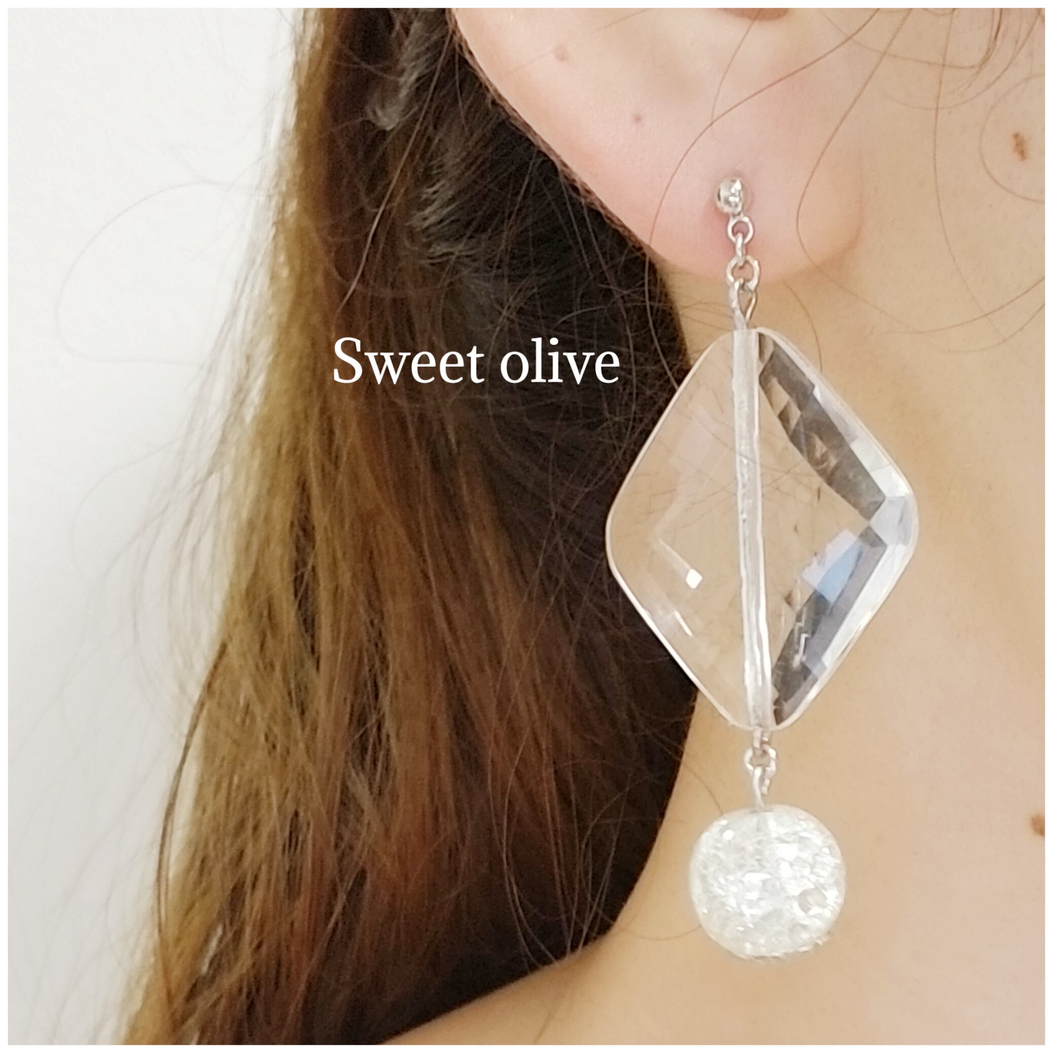 ひし形のビッグクリスタルにクラッシュビーズを合わせた大ぶりなピアスです♪