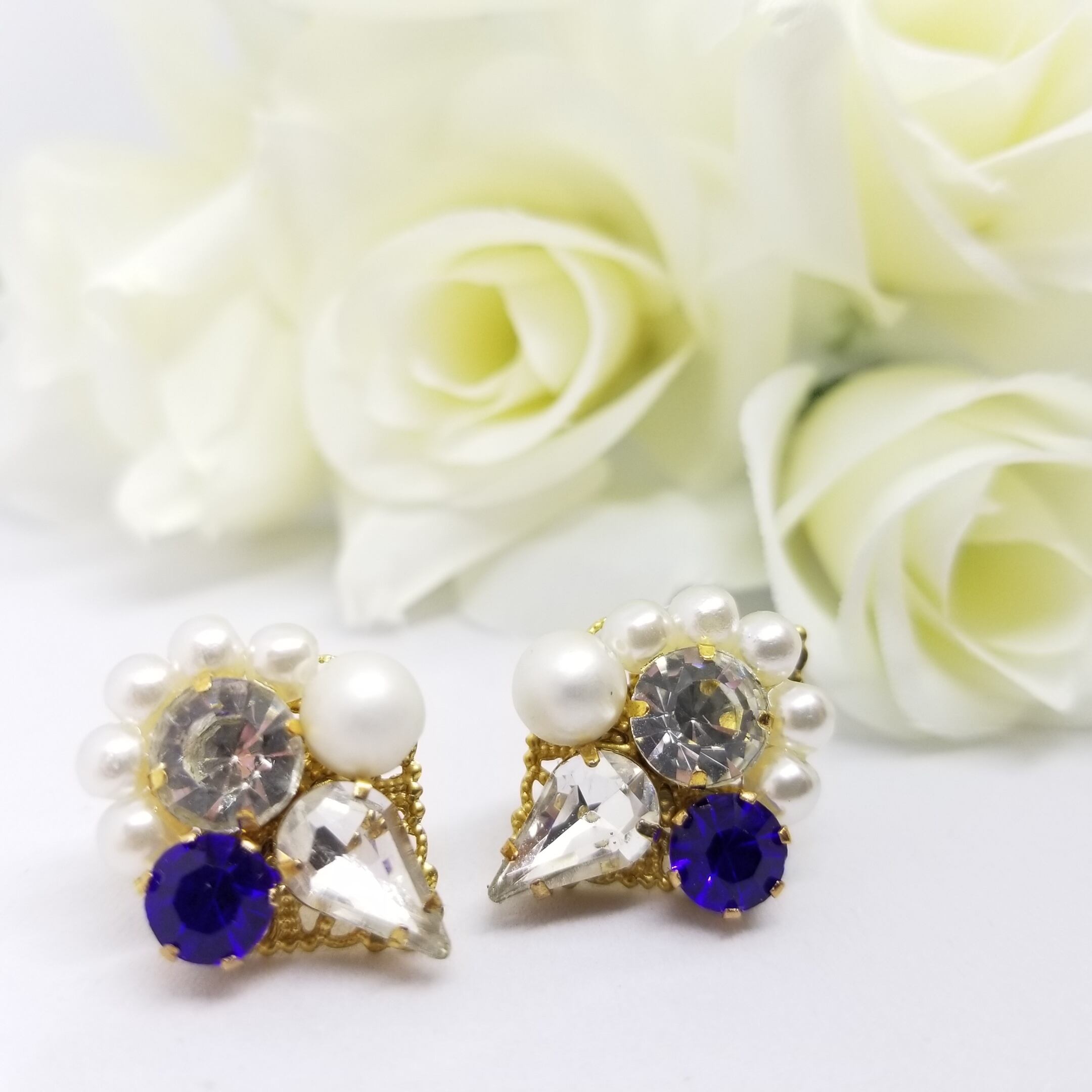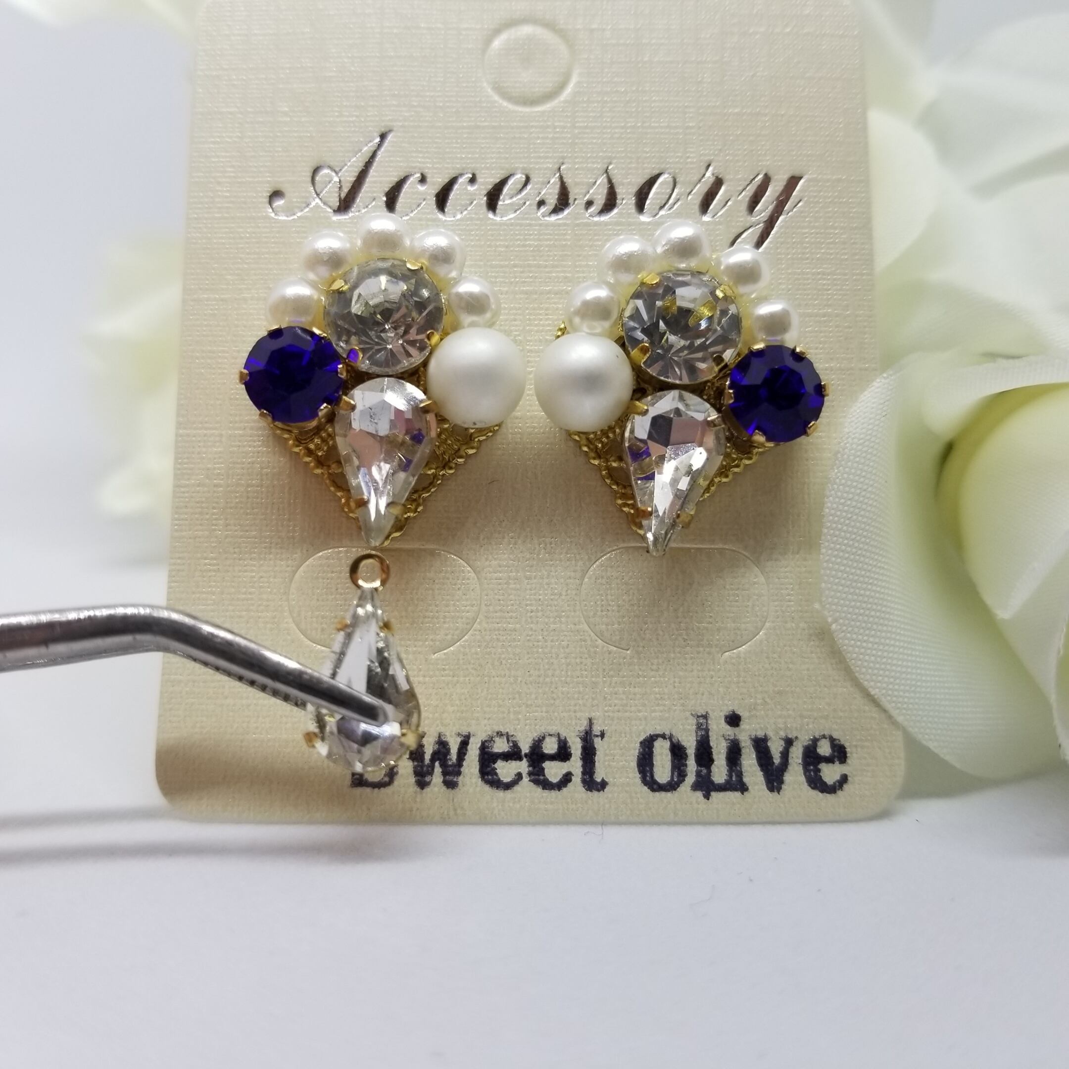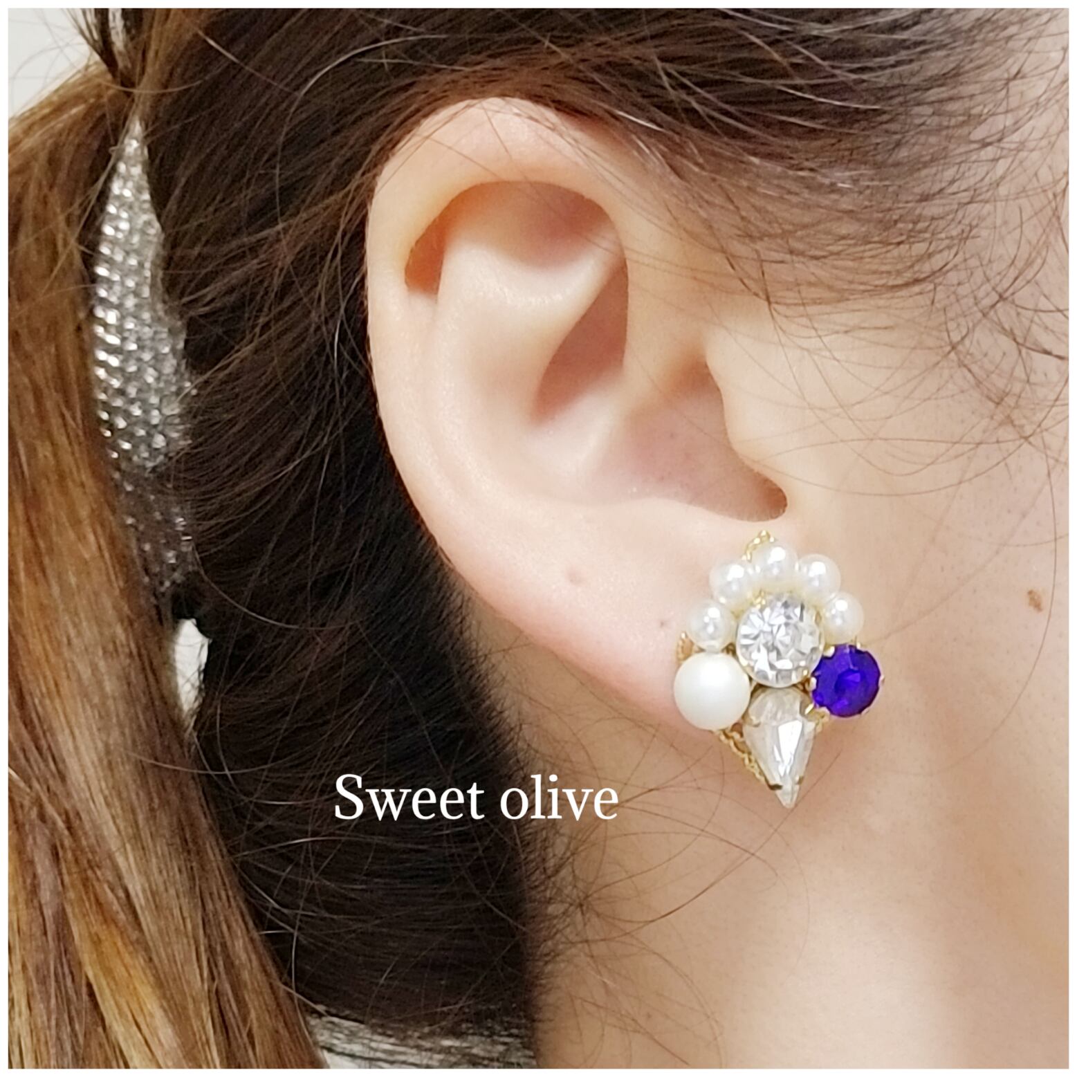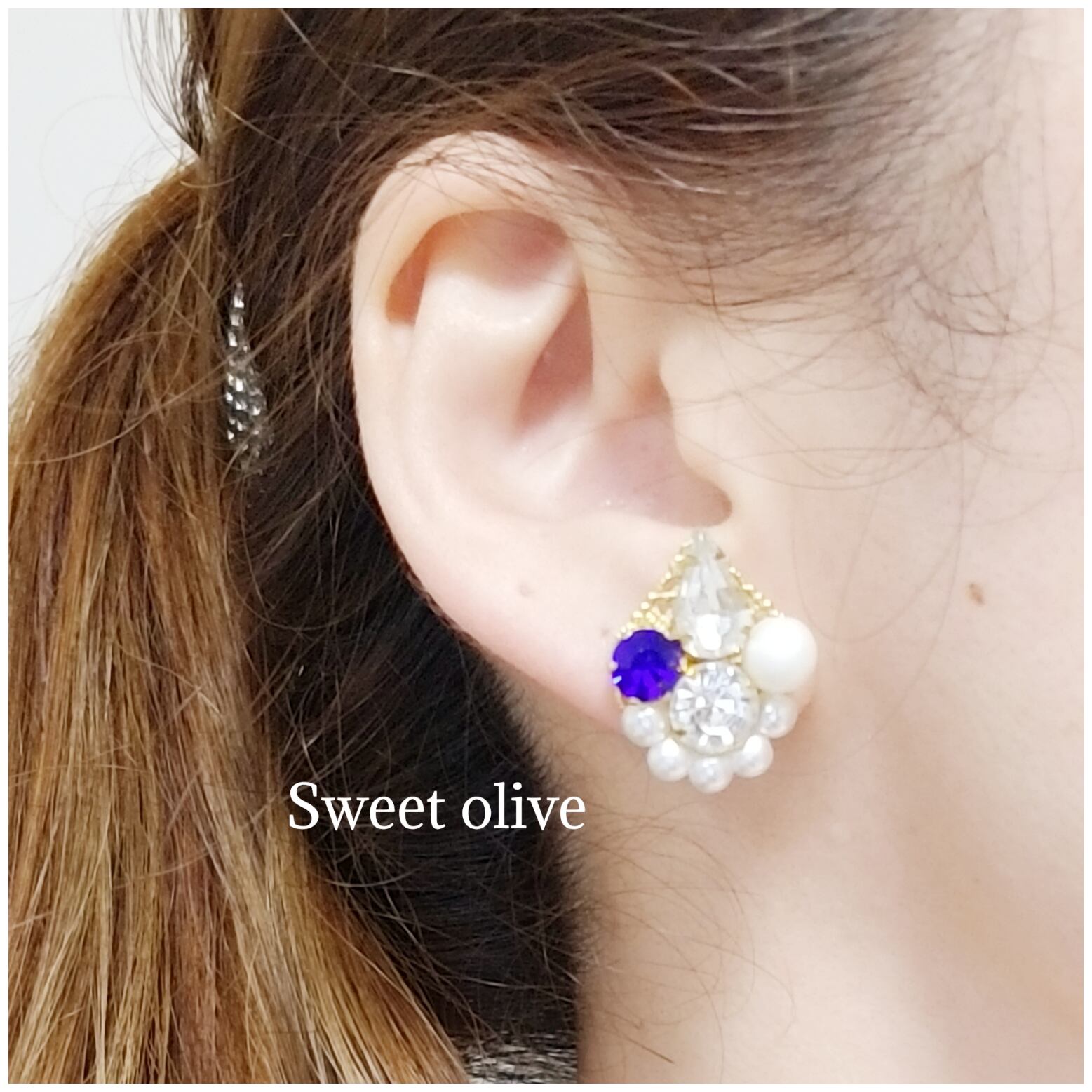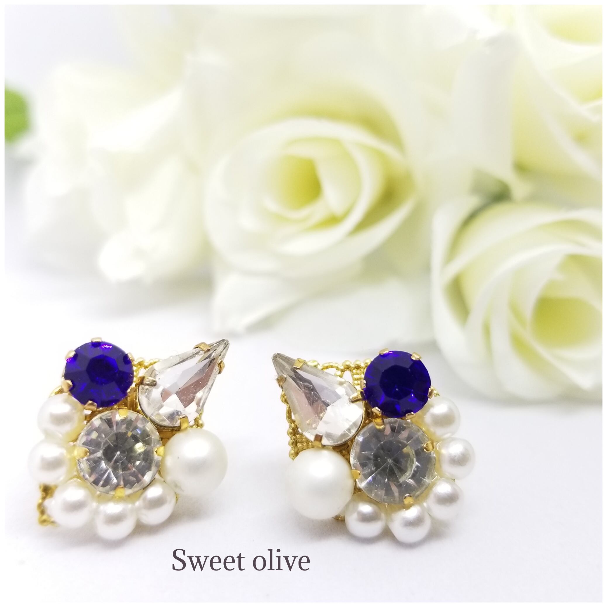 サファイヤ色のビジュー×艶消しパールのピアス♪