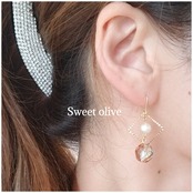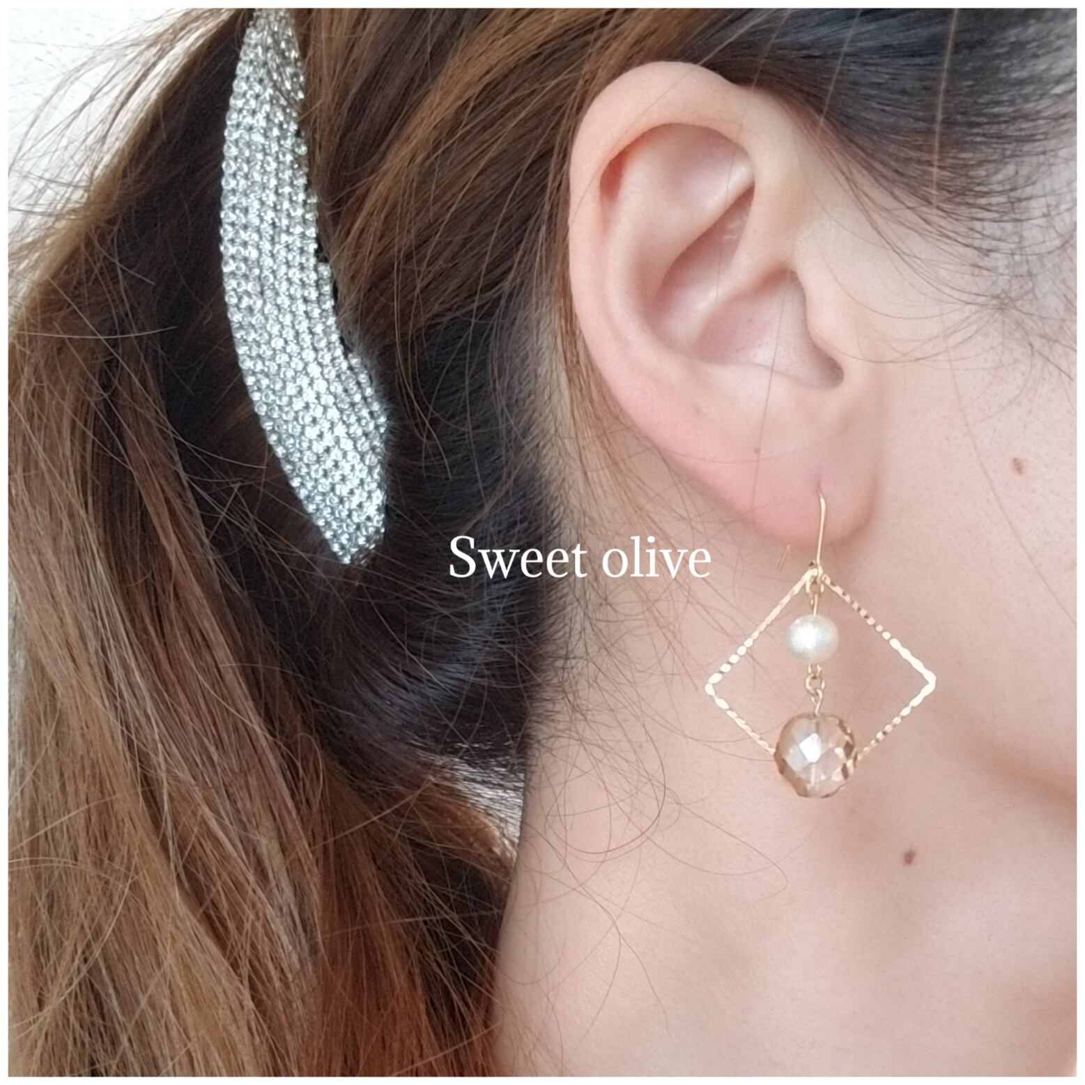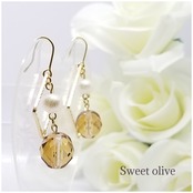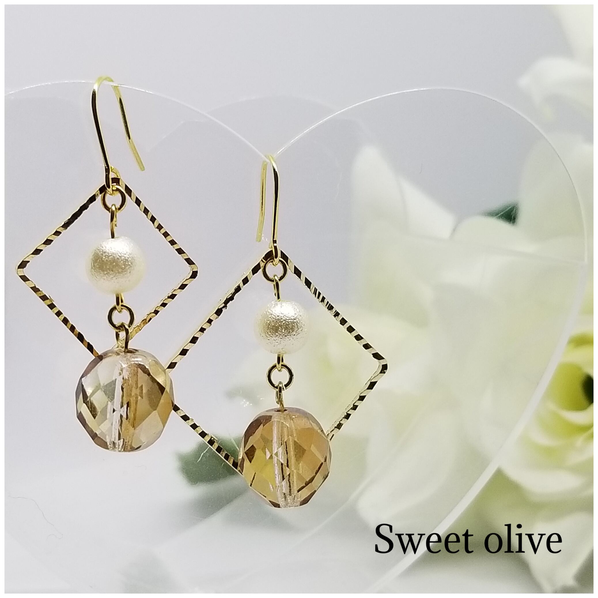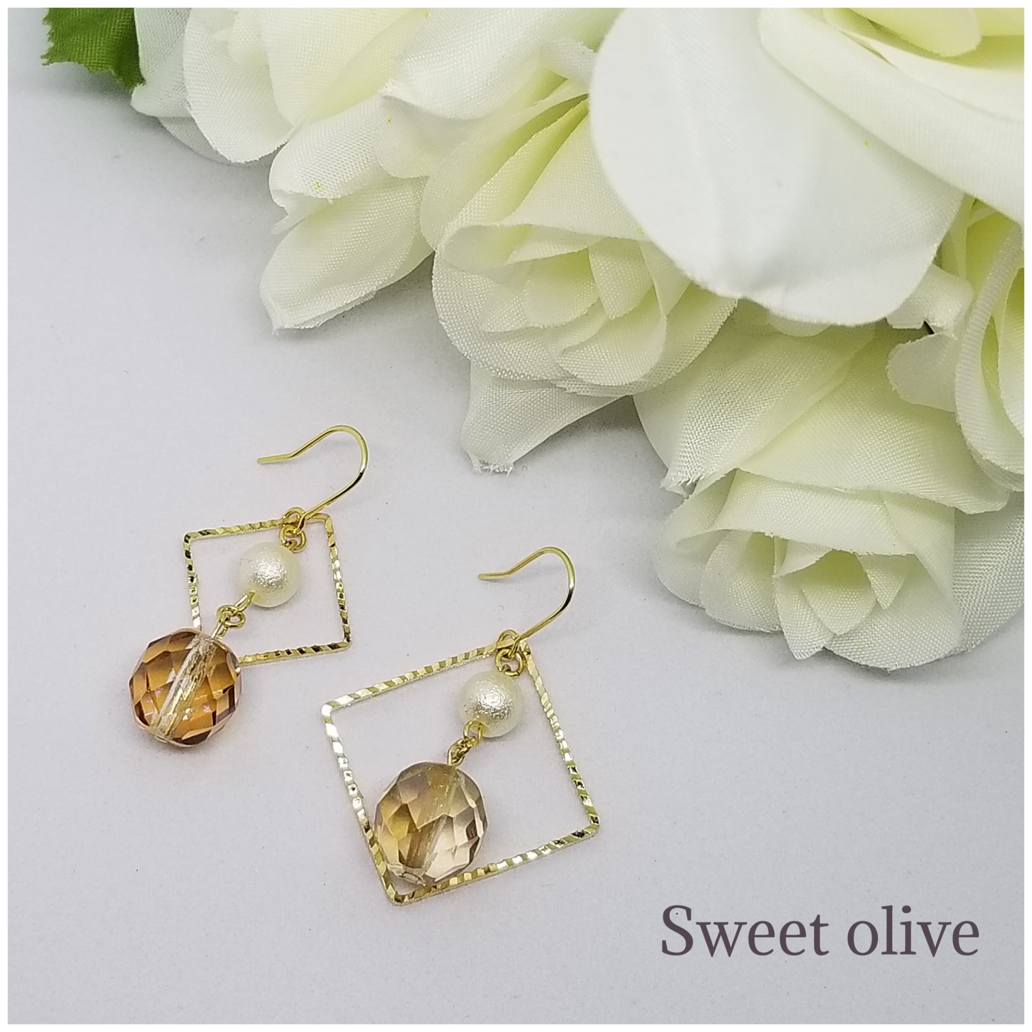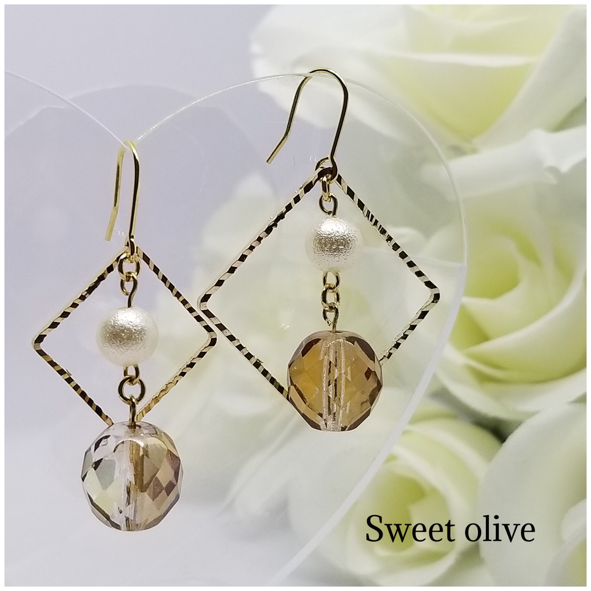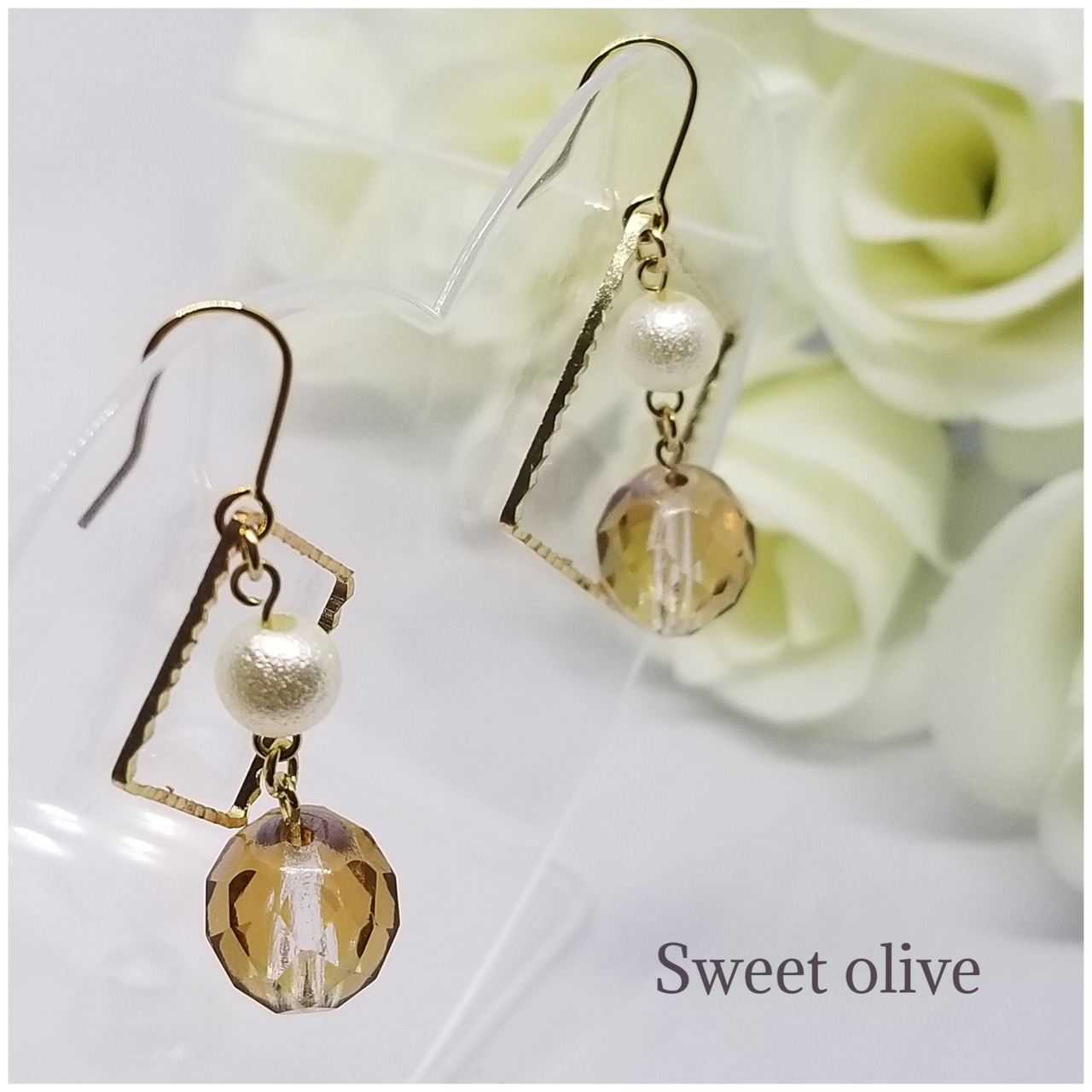 アシンメトリーのスクエアパーツにパールとキャメル色のカットチェコガラスを合わせました♪