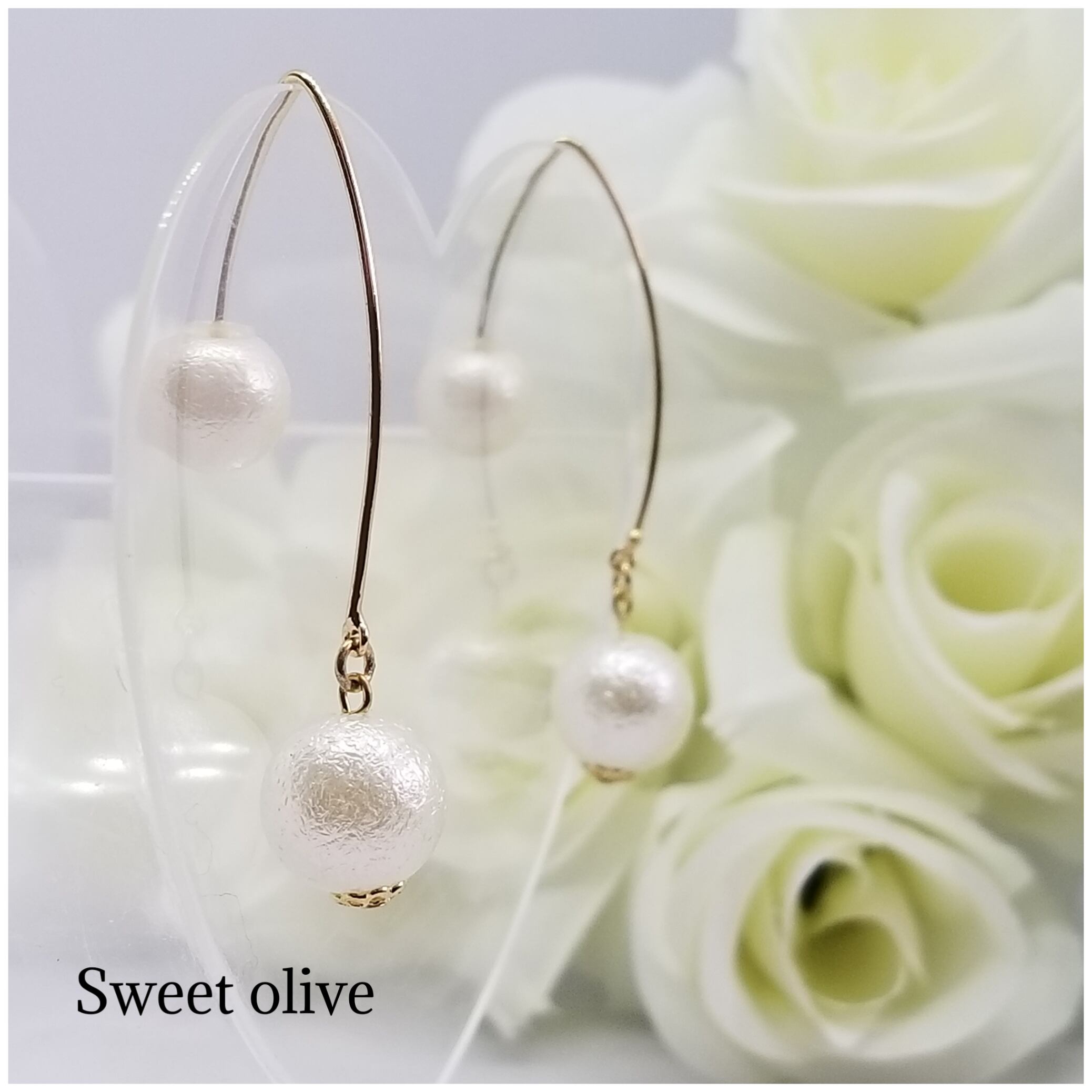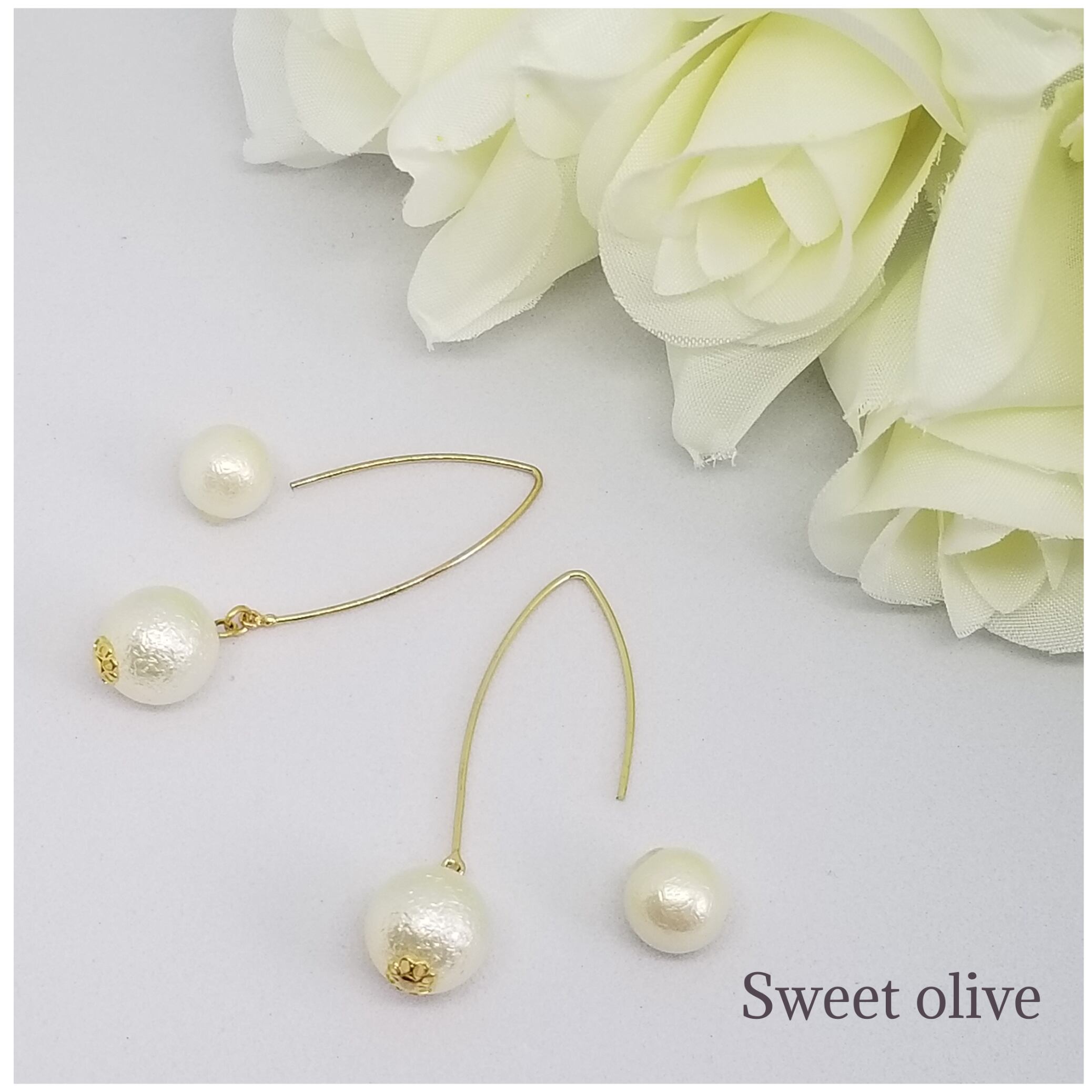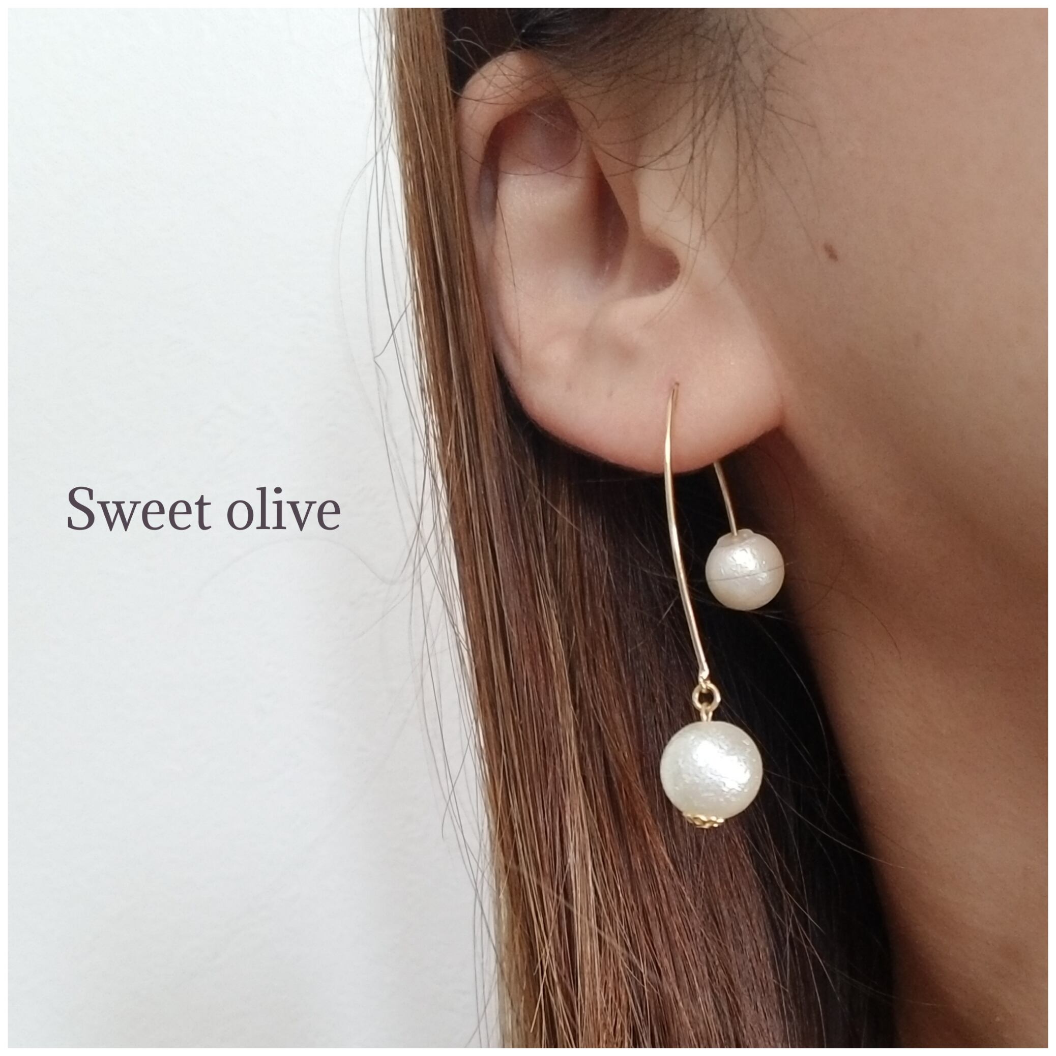 コロンとゆらゆら揺れるコットンパールが可愛いです♪さりげなく揺れるので上品。