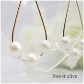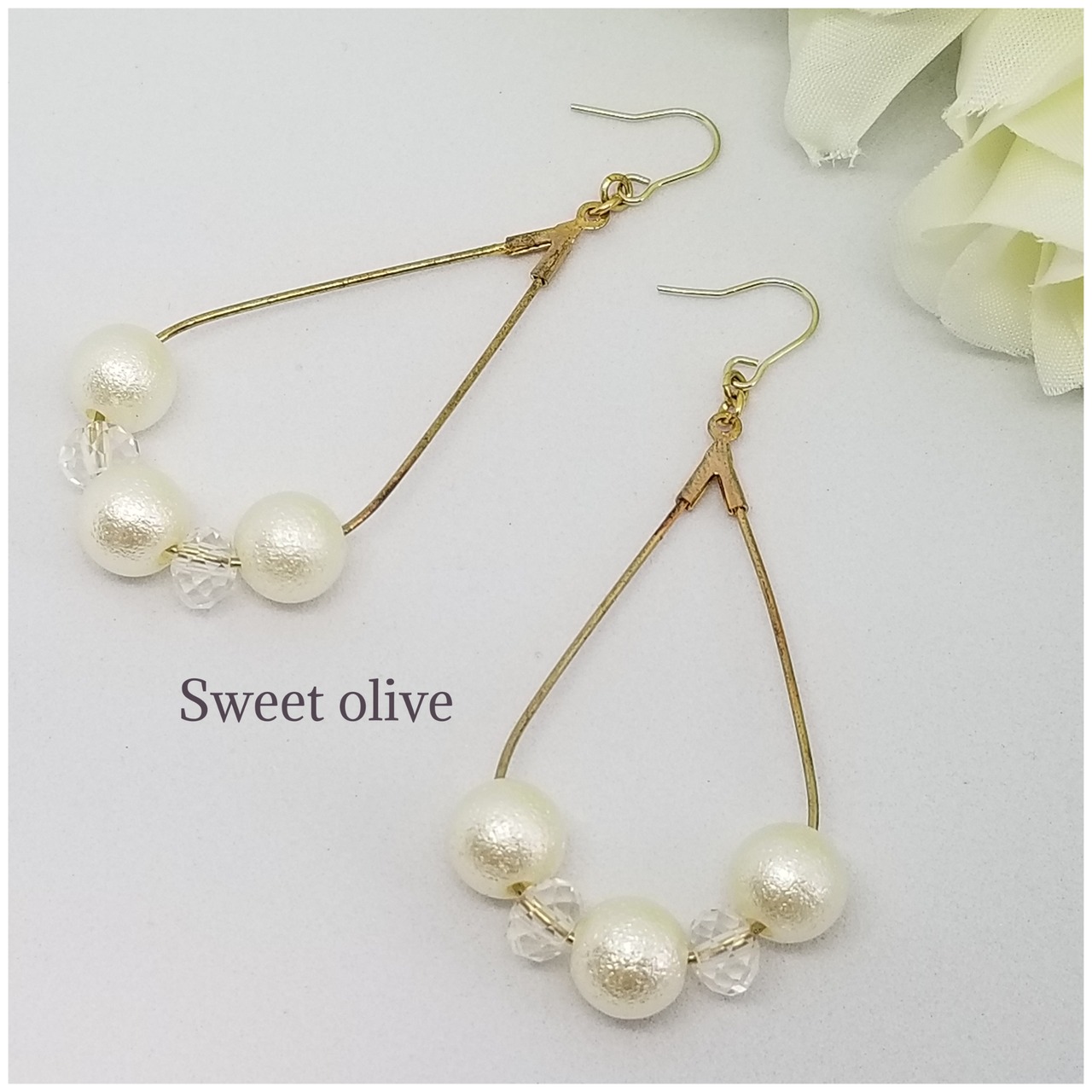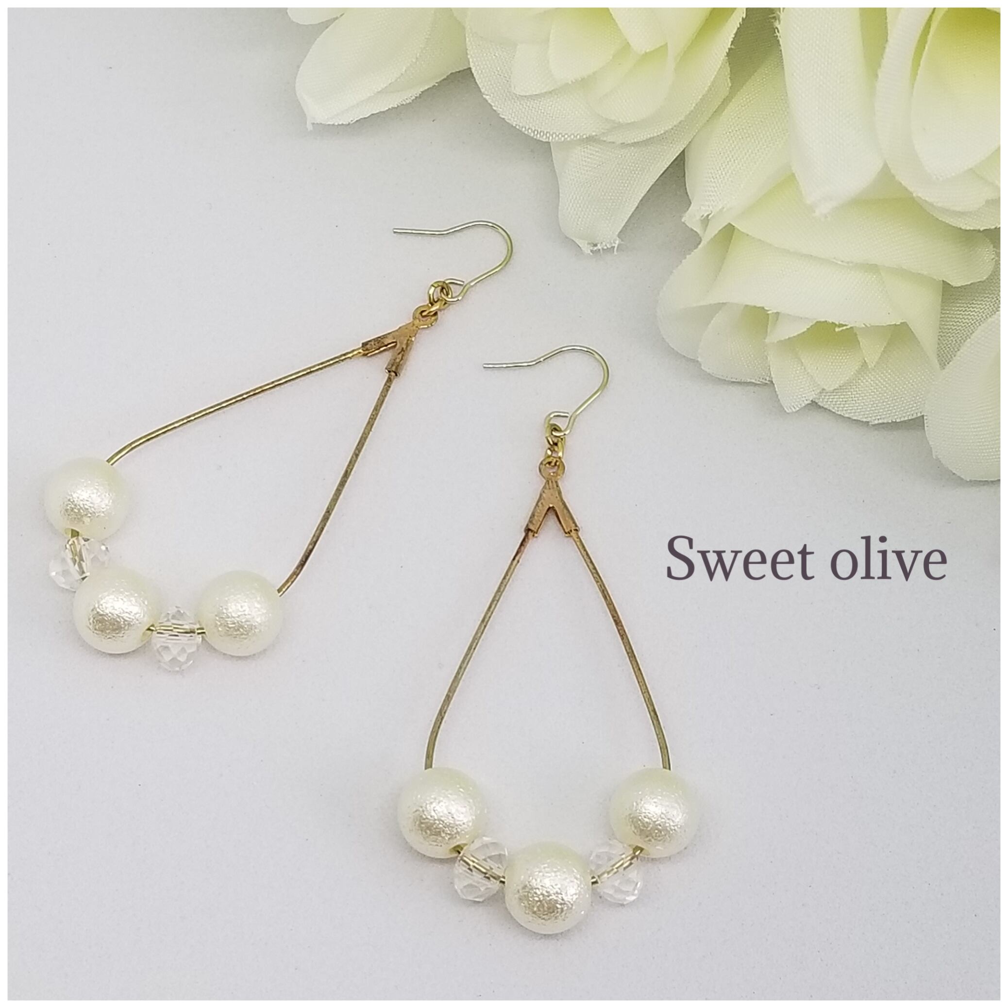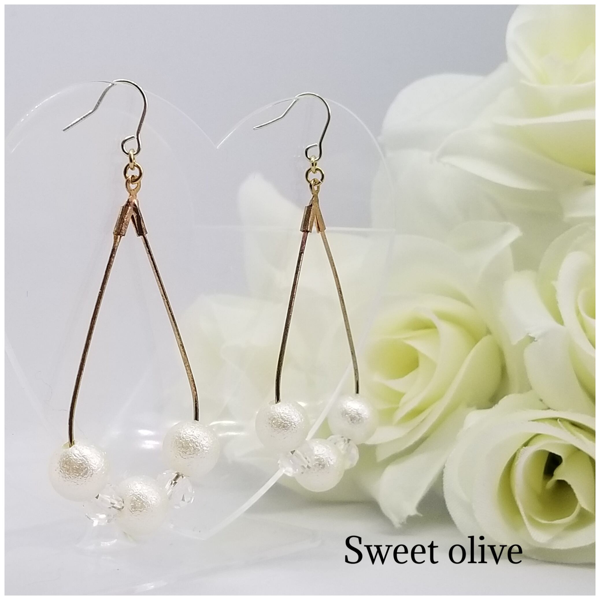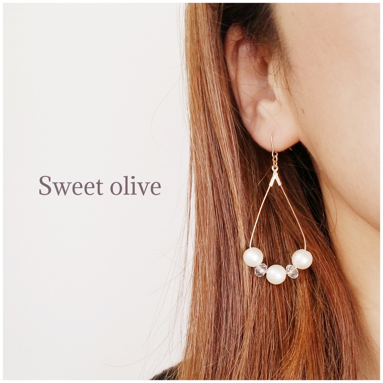 しずく型のフープにコットンパールとカットガラスを合わせました☆シンプルで上品でちょっぴり大人のピアスです♪