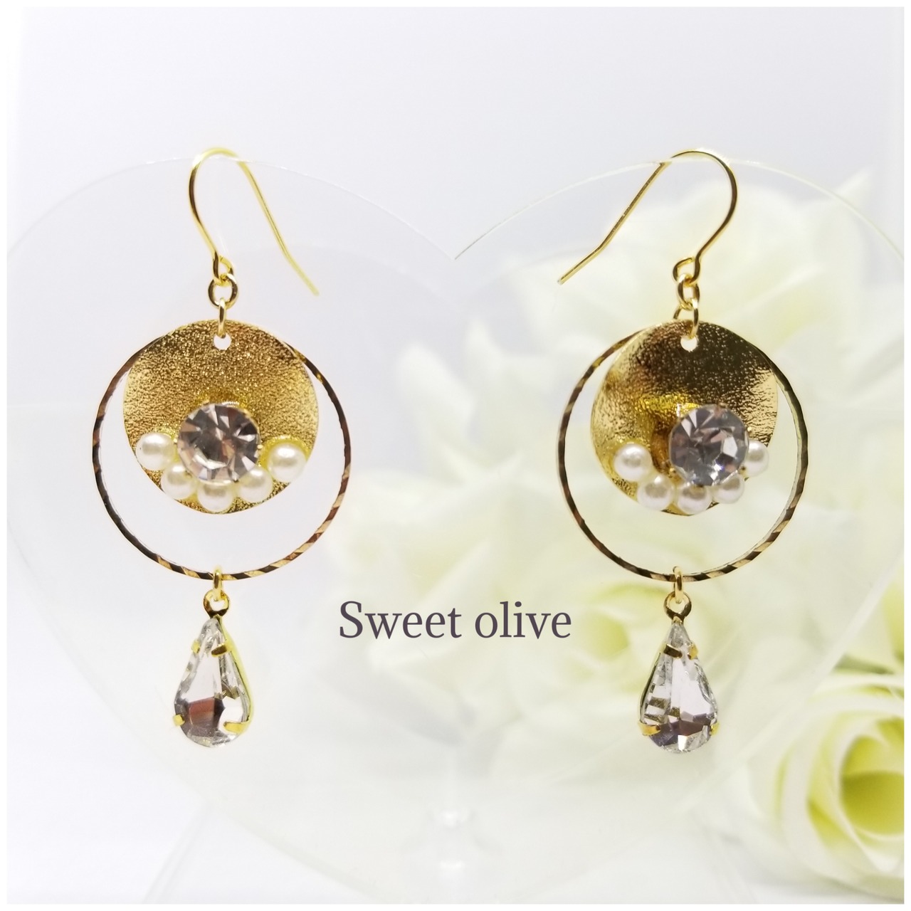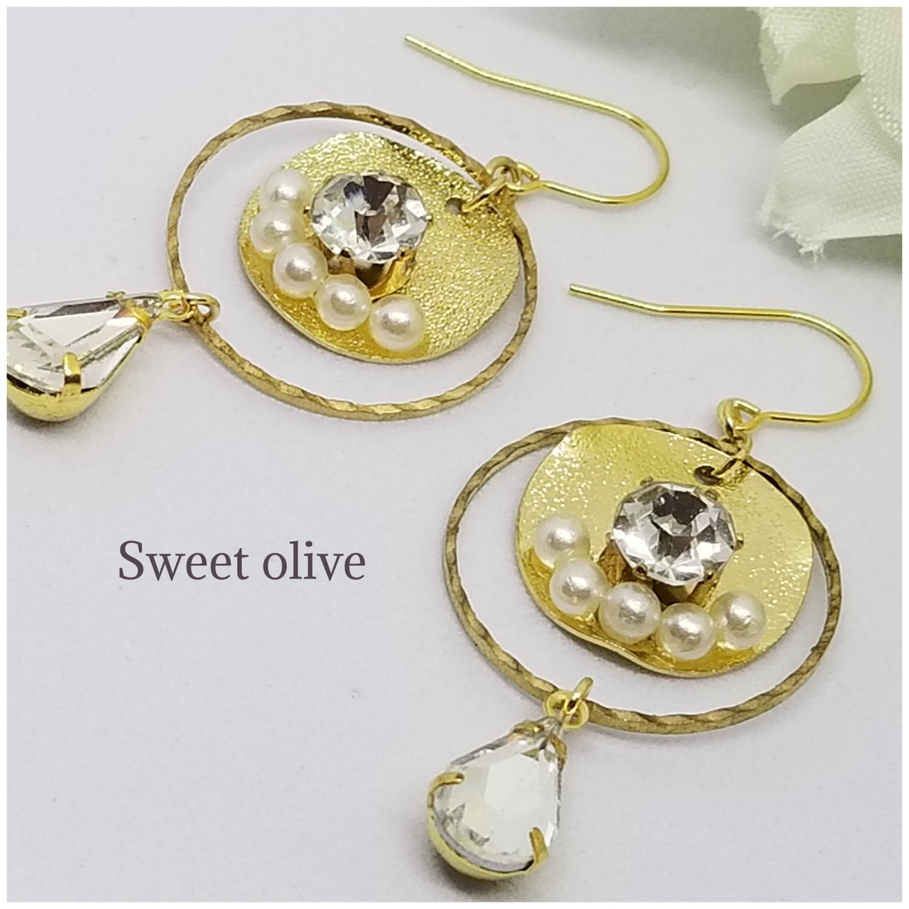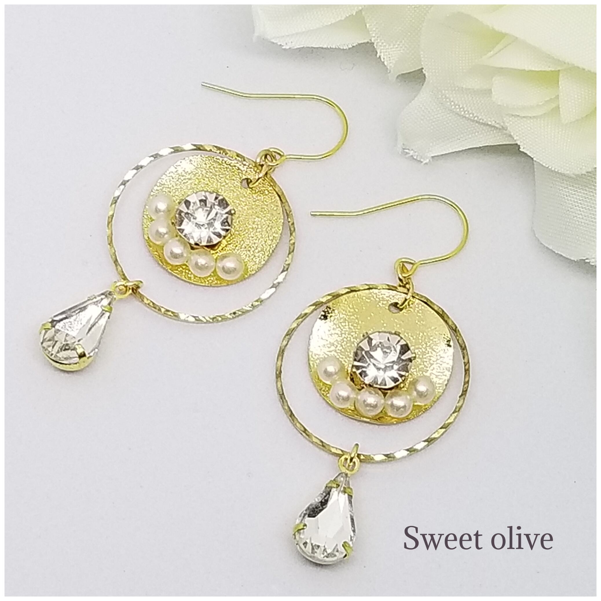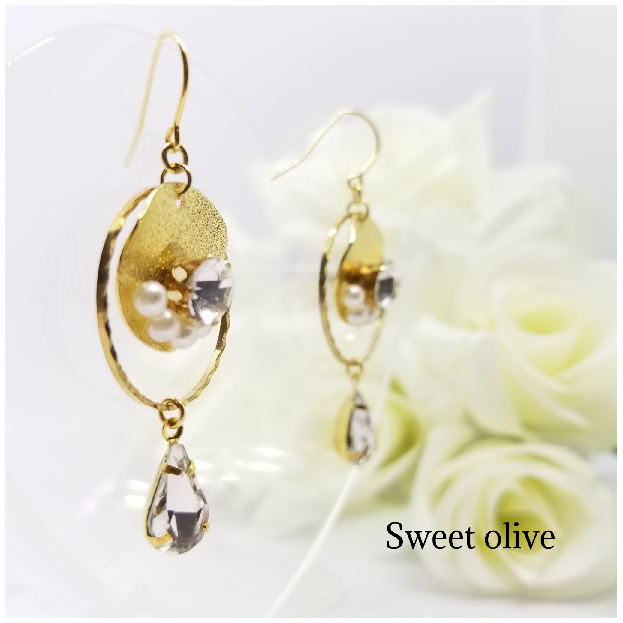 スターダスト加工が施されているプレートにカットガラスとコットンパールを合わせました♪