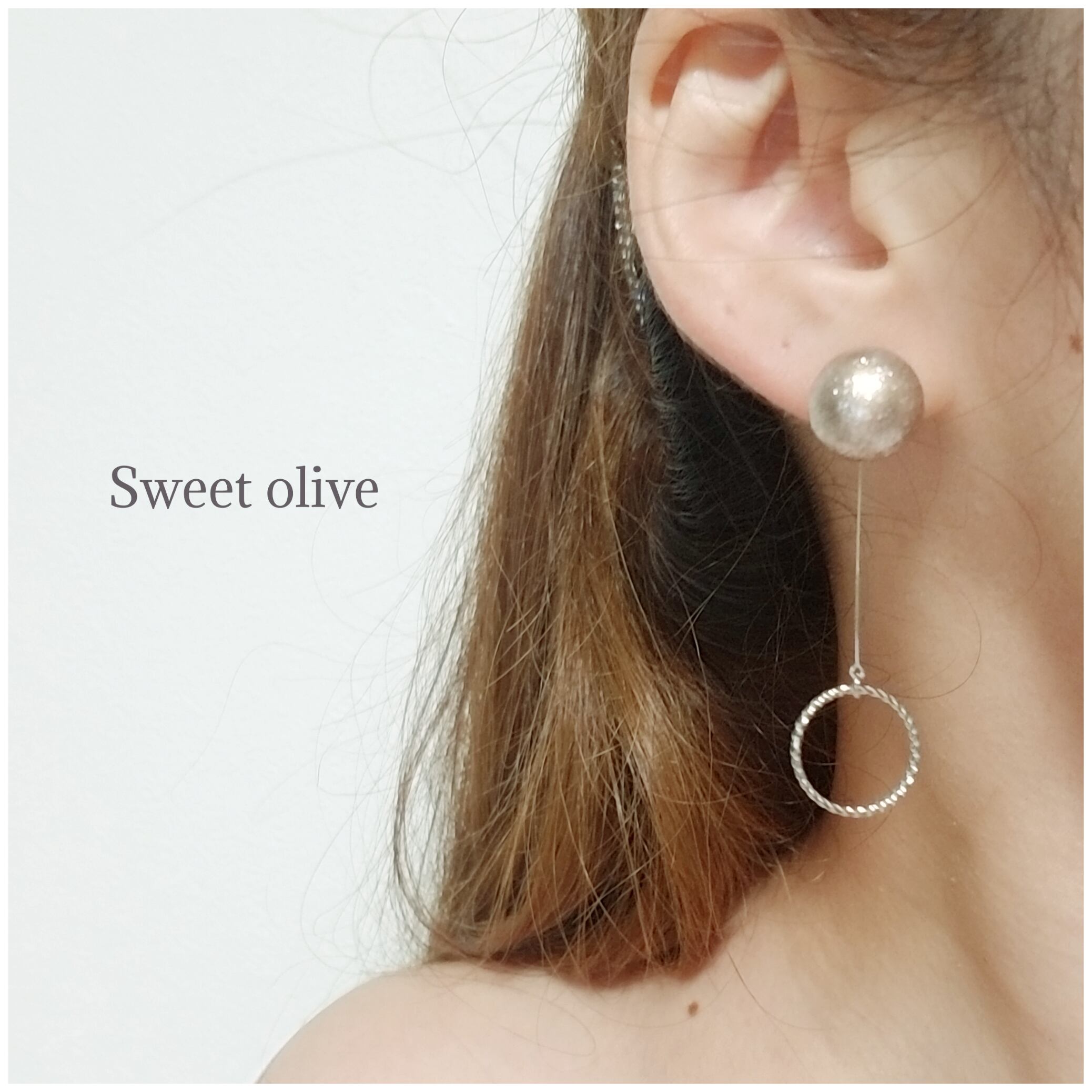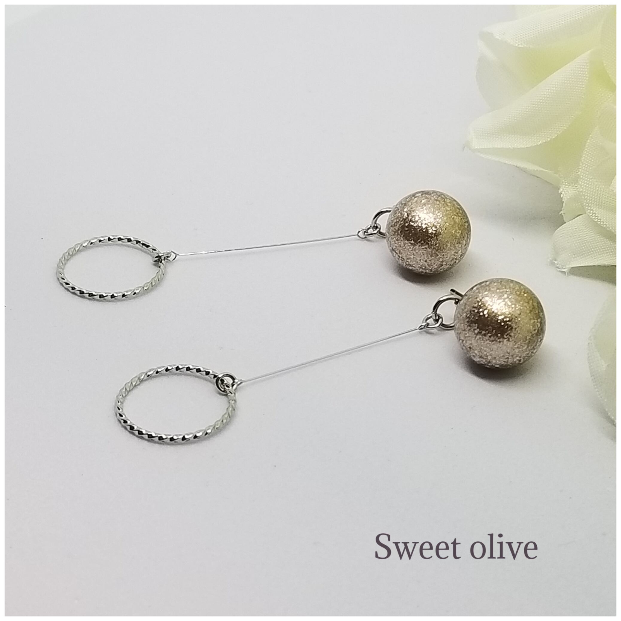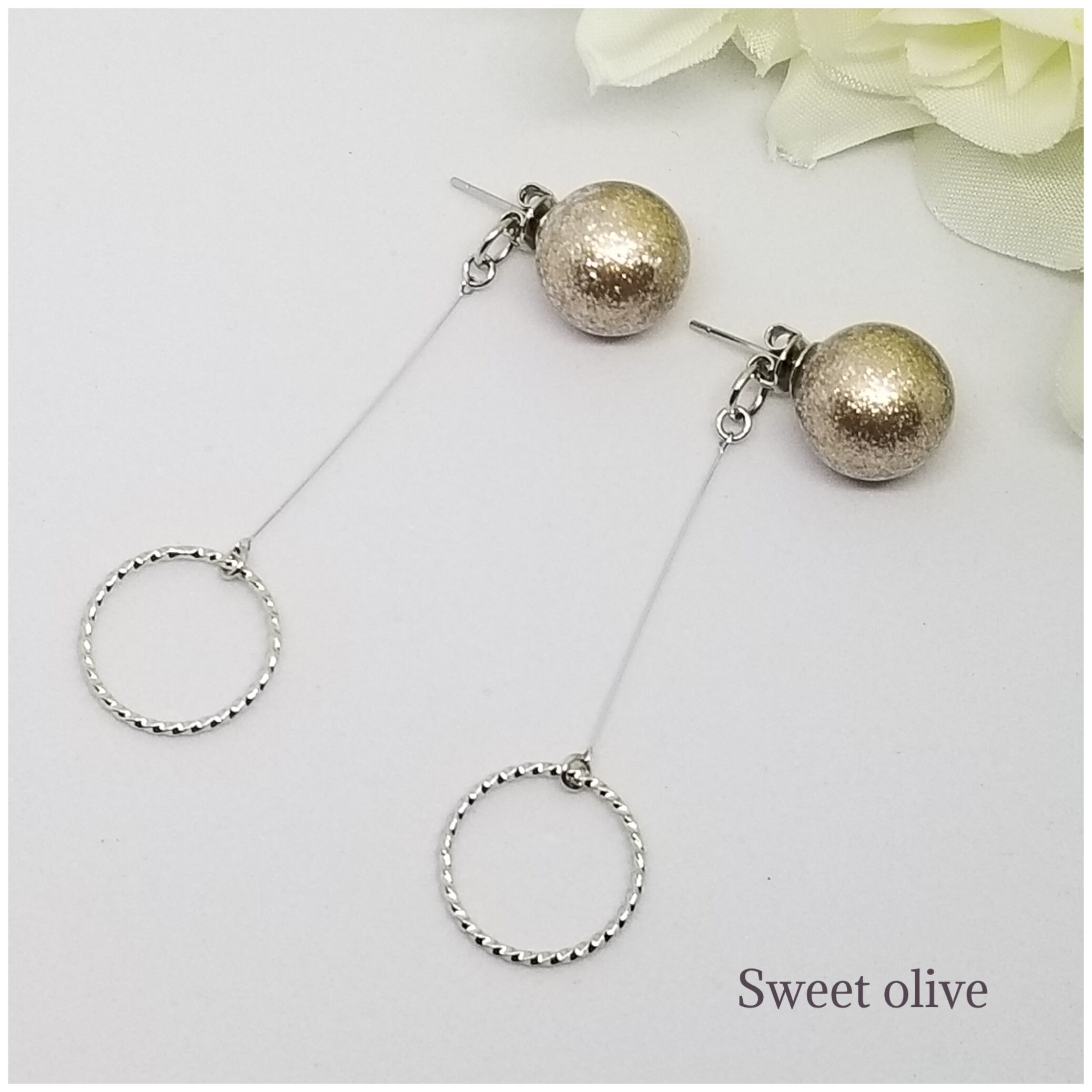 ブロンズシャイニーパール&デザインリングのピアスです☆ラメがキラキラ入ったパールが大人可愛く、ゆらゆら揺れるデザインリングがシンプルです♪
