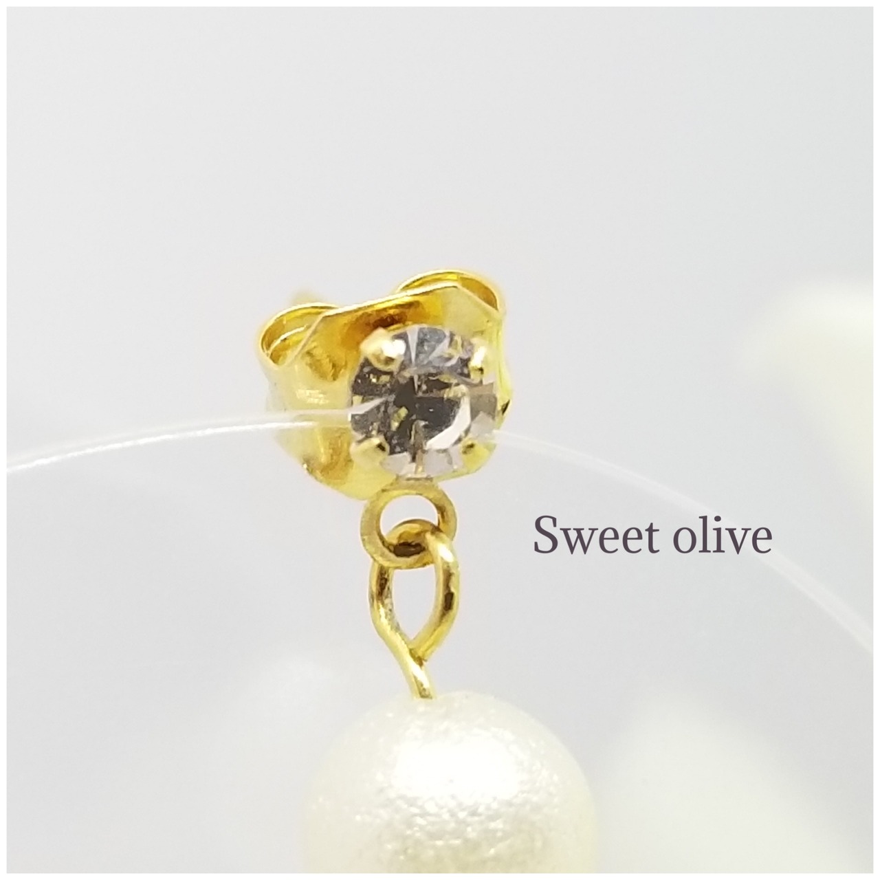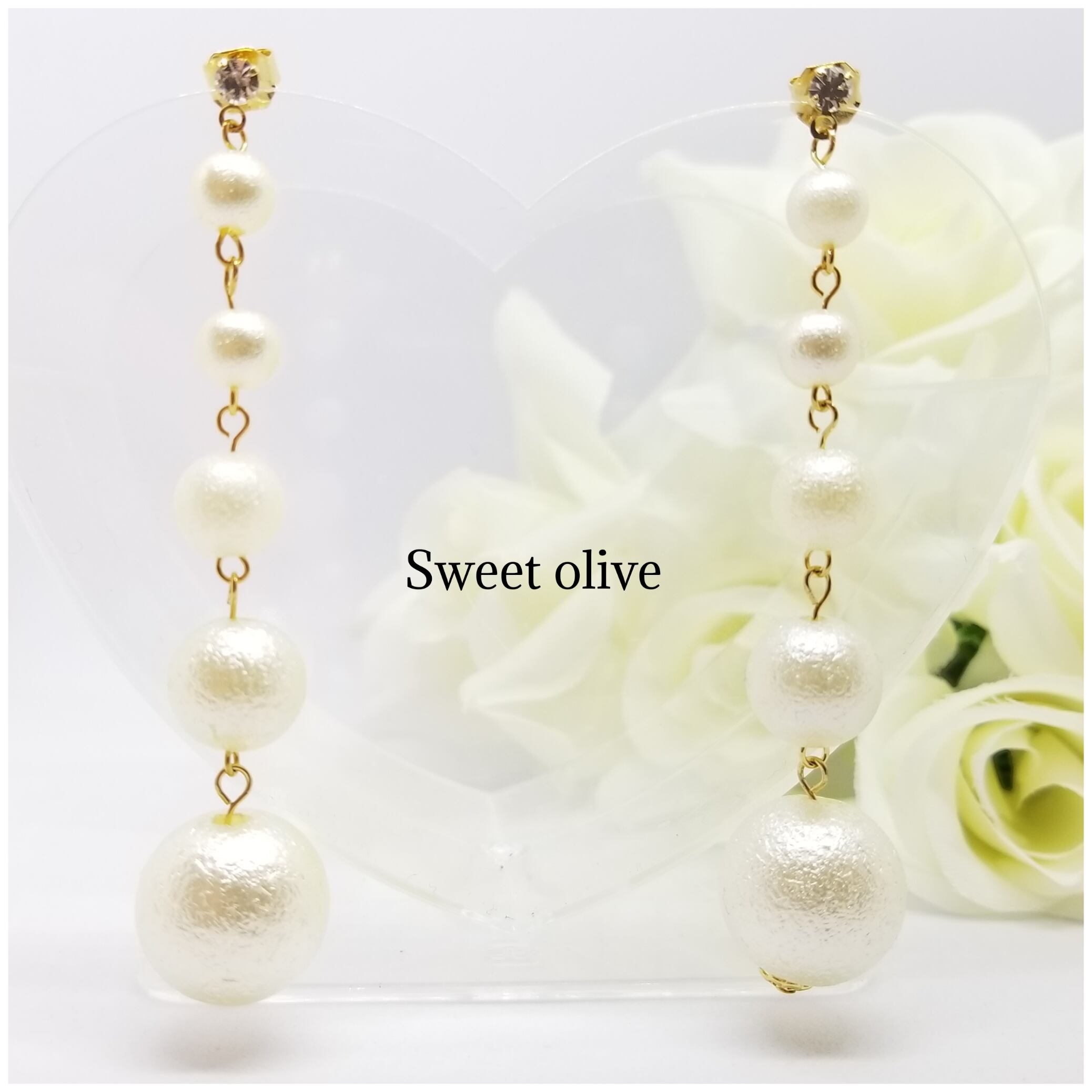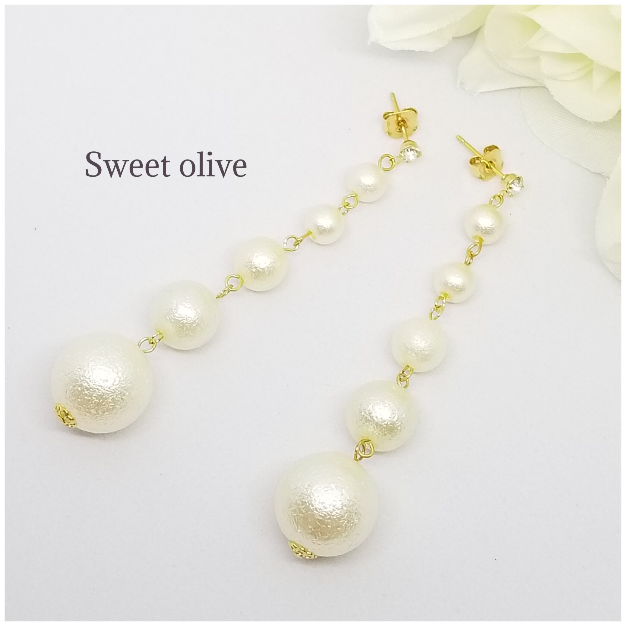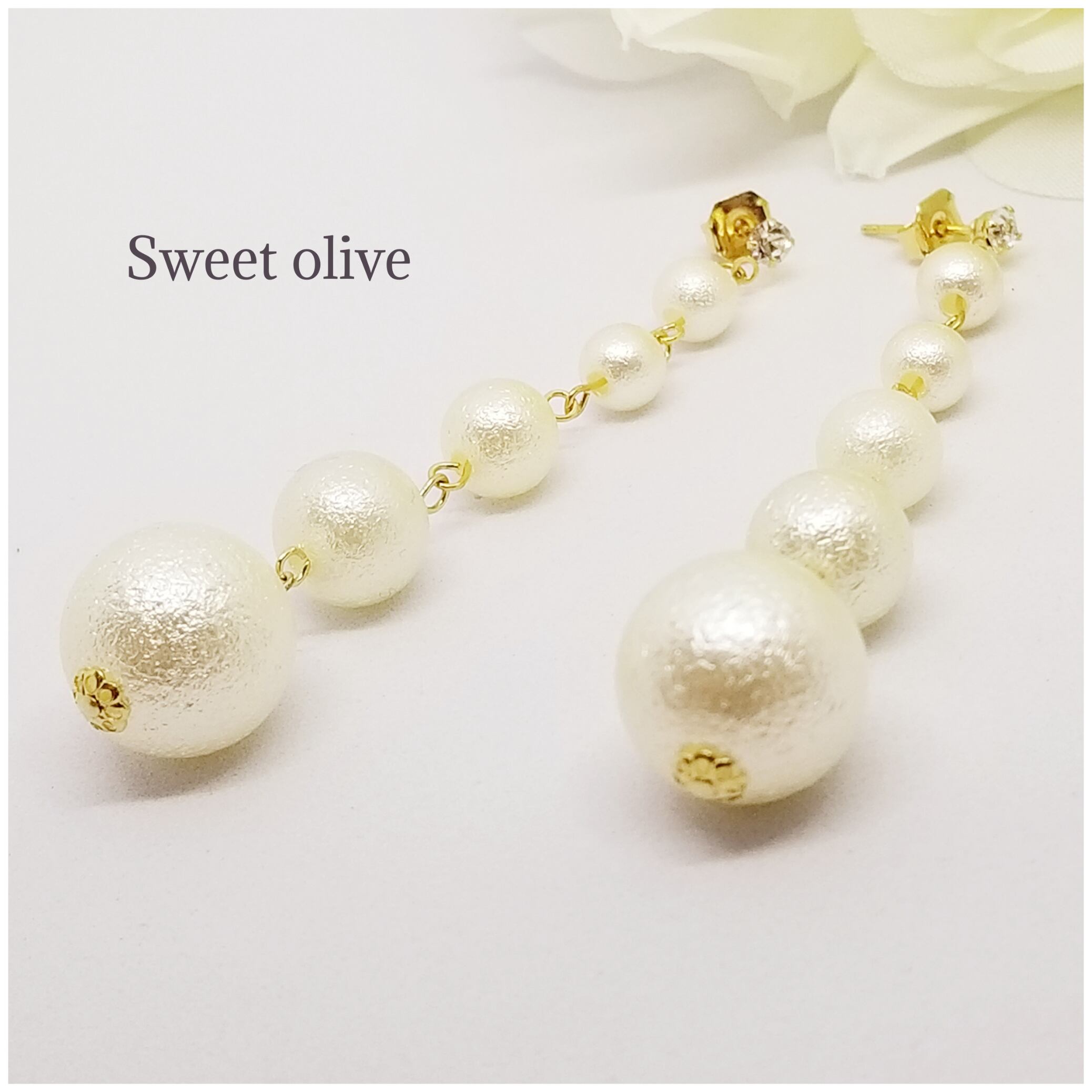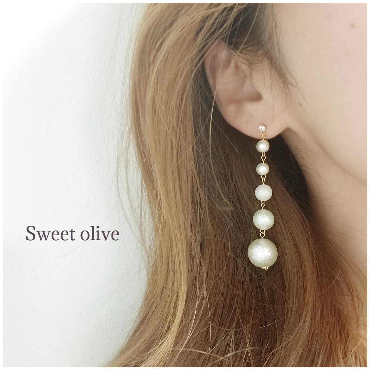 大きさが異なるコットンパールを小→大にすることにより、動きある魅力あるピアスに仕上げました♪