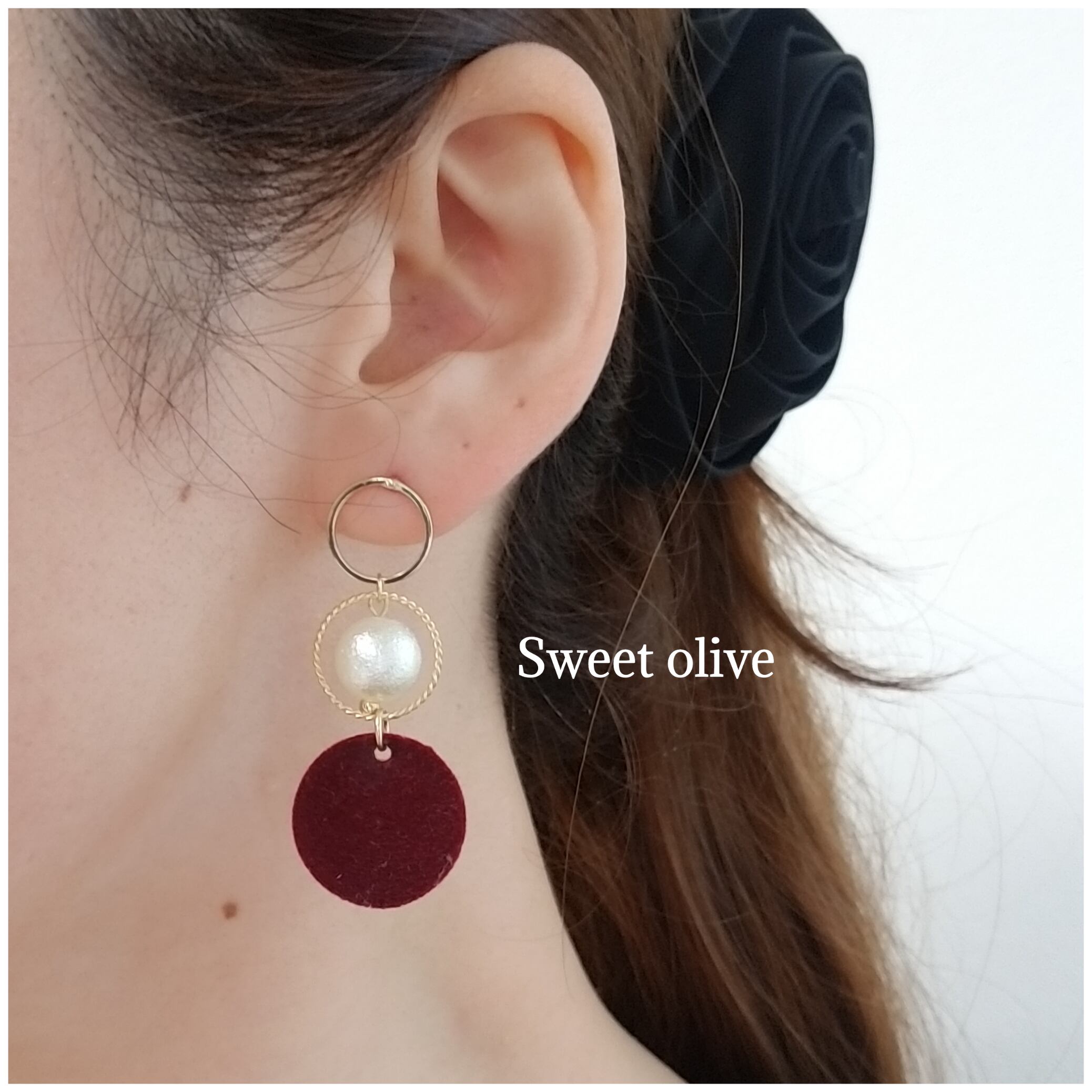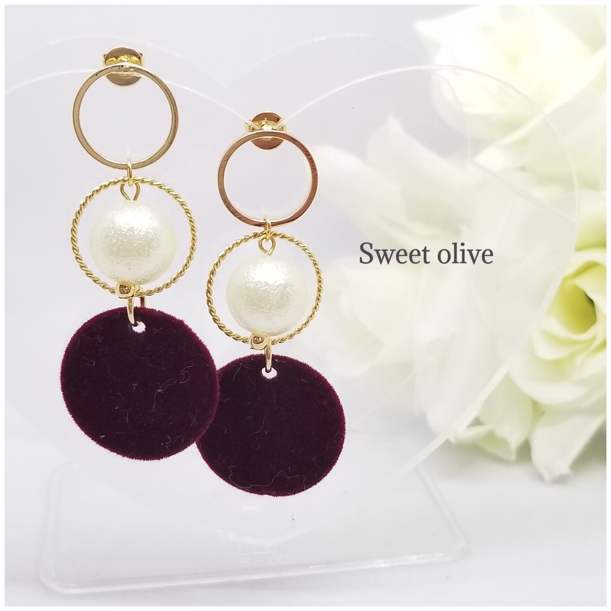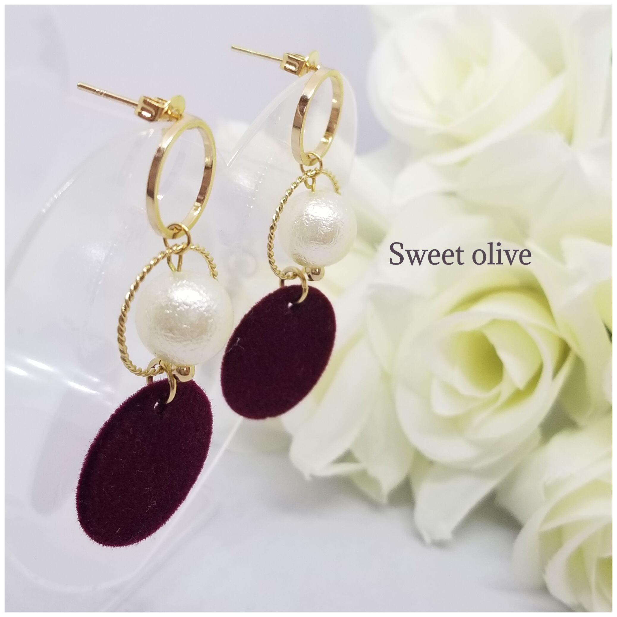 リングとパールとベルベット素材のボルドーを合わせたピアスです☆