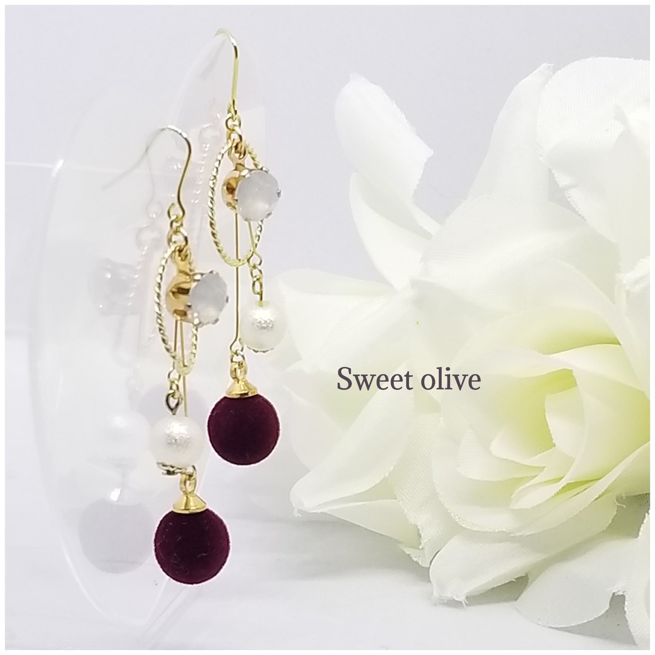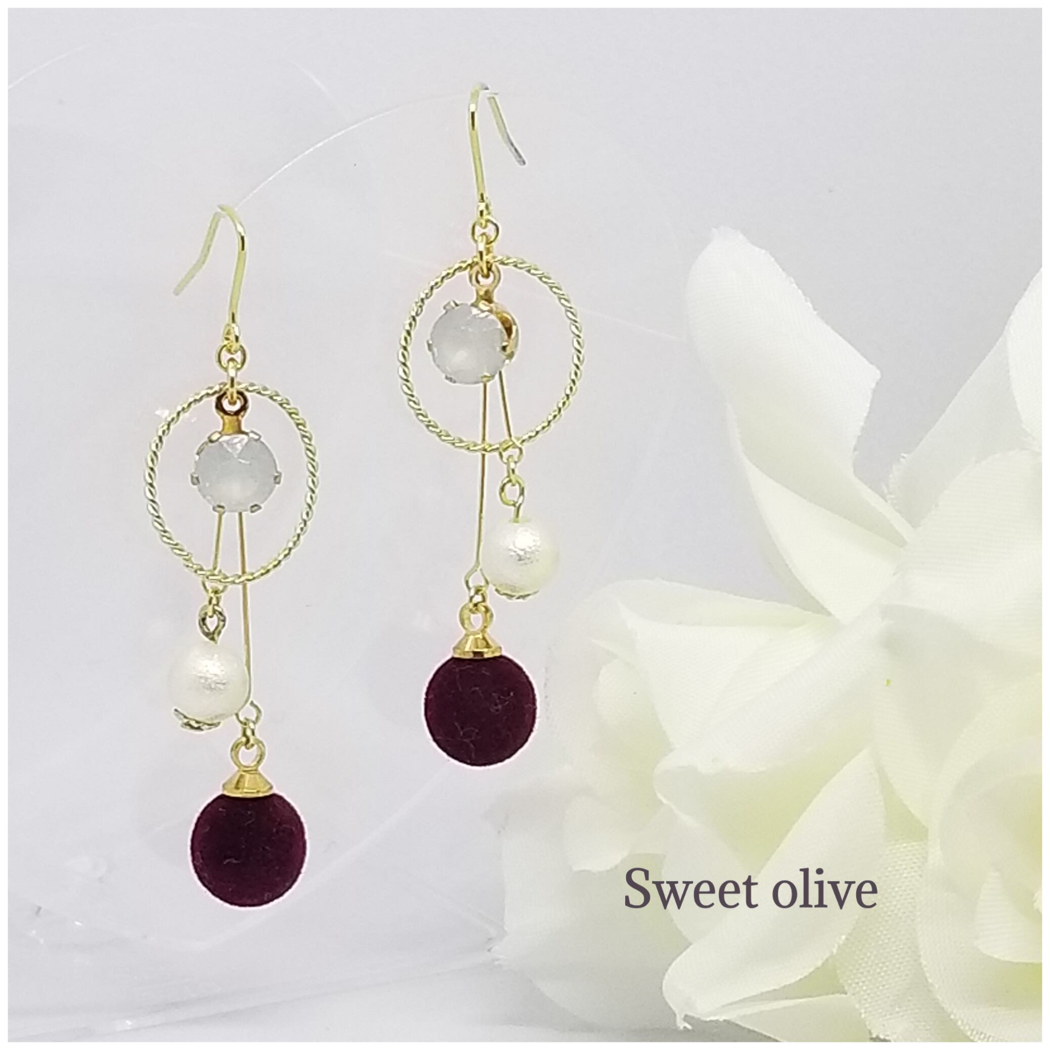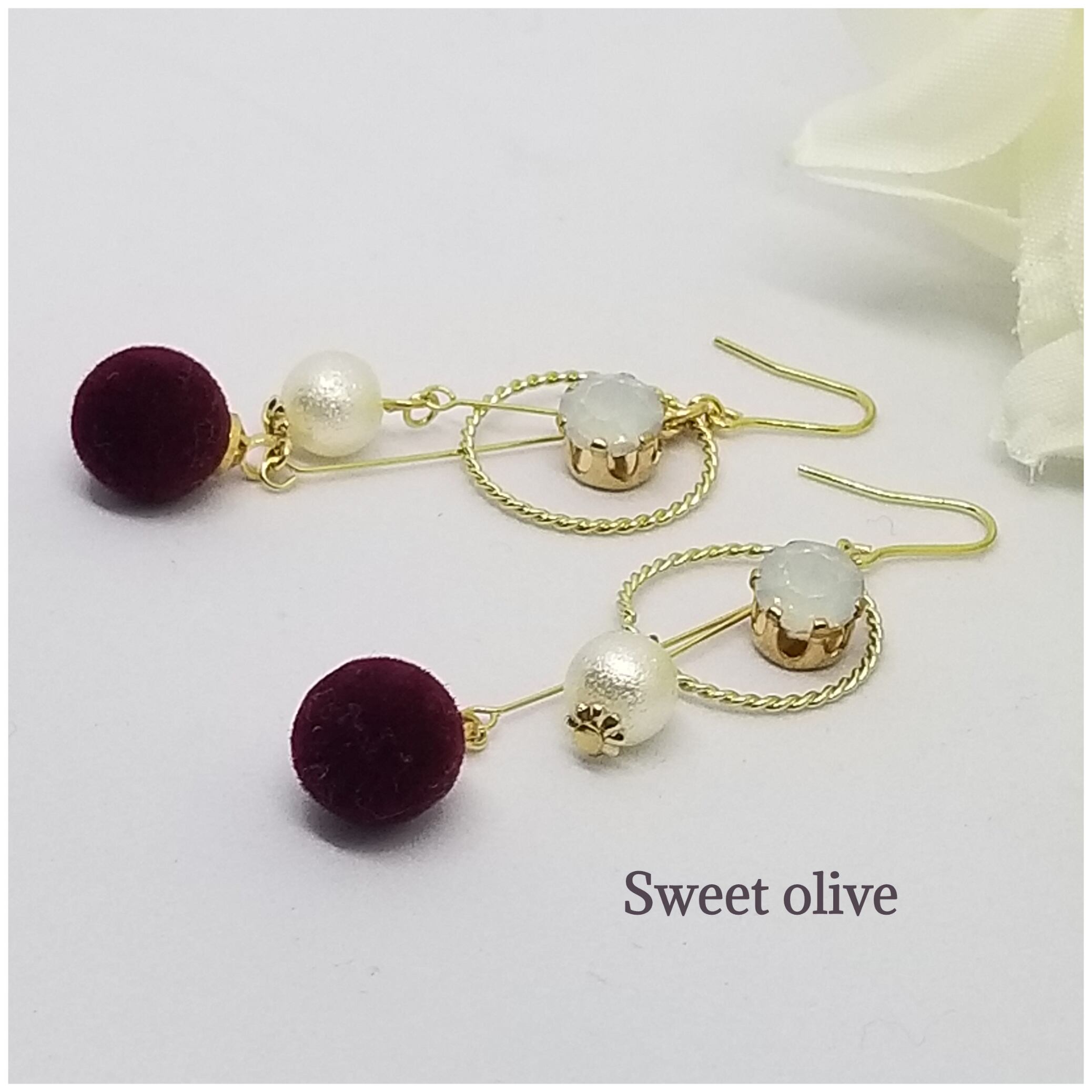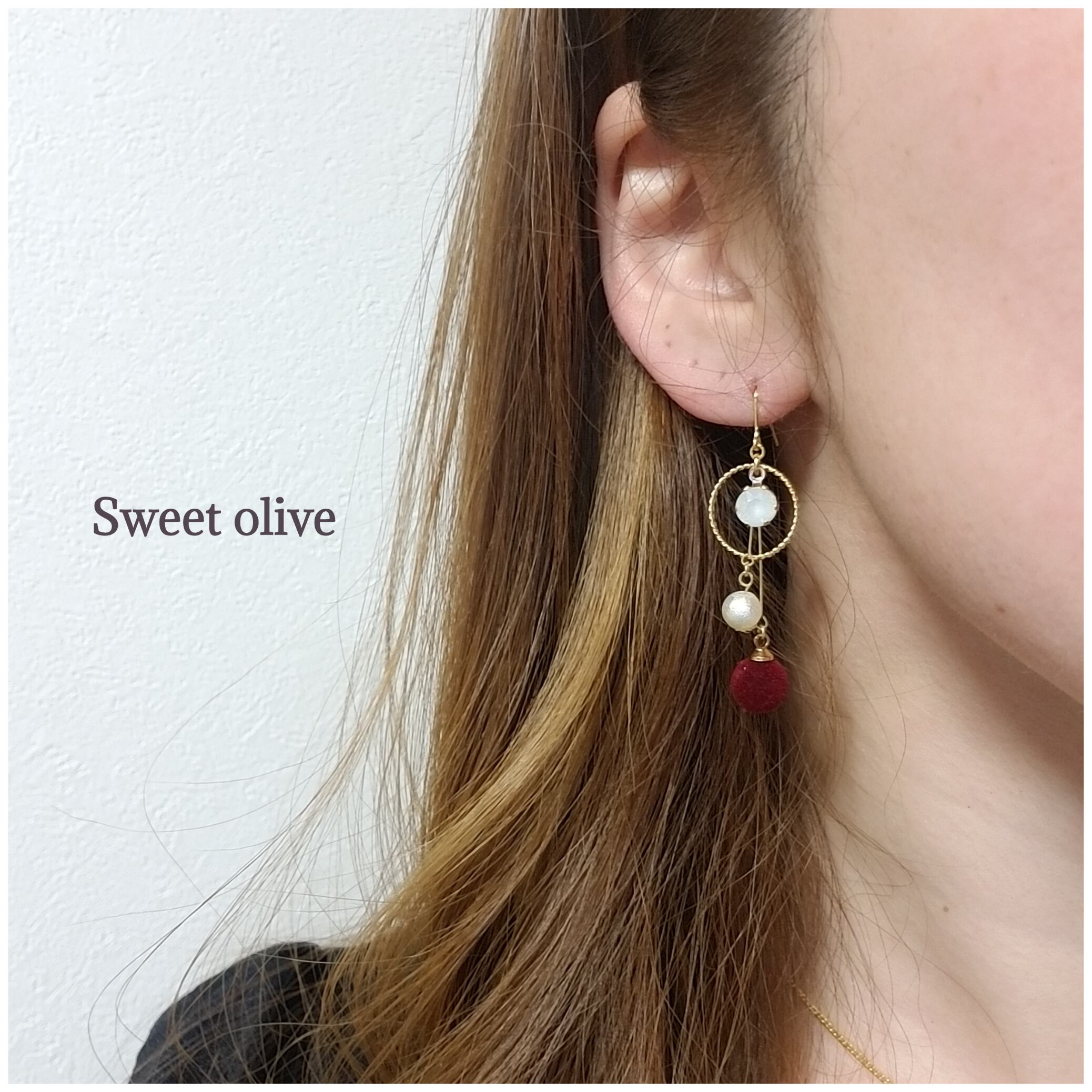 オパールカラーのストーンとボルドー、パールを使用して女性らしい上品なピアスに仕上げました♪